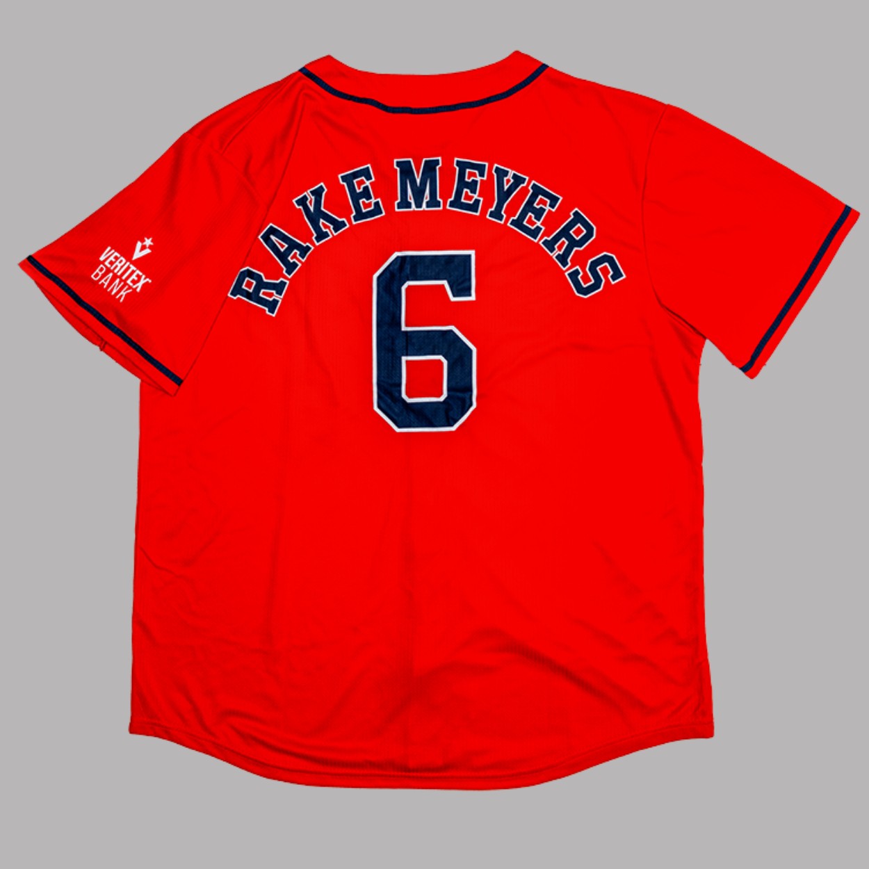 - The back of the jersey proudly features “RAKE MEYERS” in a bold, navy blue, arced font, perfectly centered above the player’s number “6.”