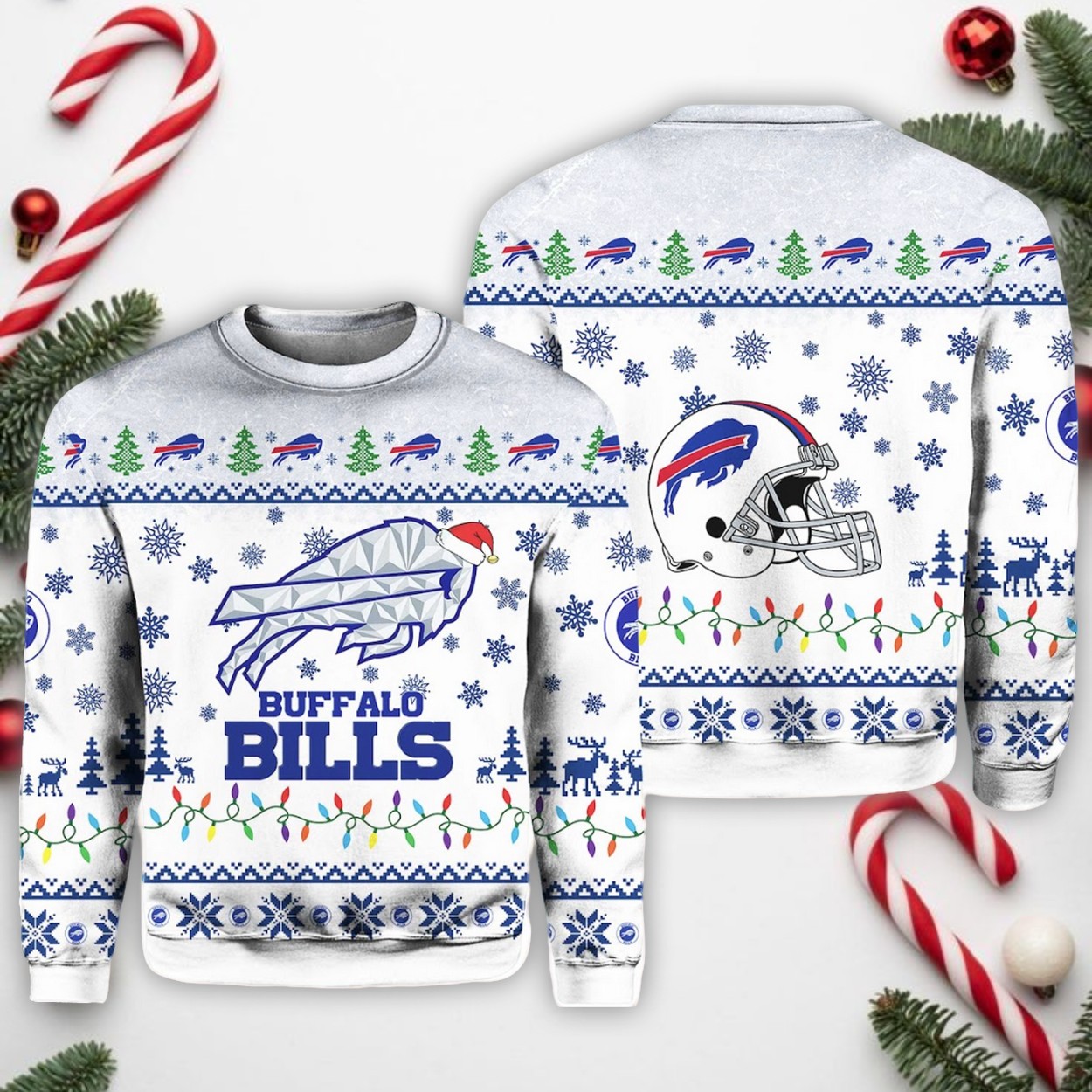 This sweater is crafted from polyester, providing a comfortable and cozy fit that’s perfect for chilly game days or holiday parties. The design is a vibrant mix of classic holiday motifs and team-specific graphics. The front features the iconic Bills logo wearing a Santa hat, along with a string of colorful lights. The back proudly displays a detailed Bills helmet, surrounded by a festive snowy landscape. The all-over pattern, including snow-dusted trees and snowflakes, makes this sweater a true standout. Available in a wide size range from S to 6XL, it ensures that every Bills fan can find the perfect fit to celebrate the holidays in style.