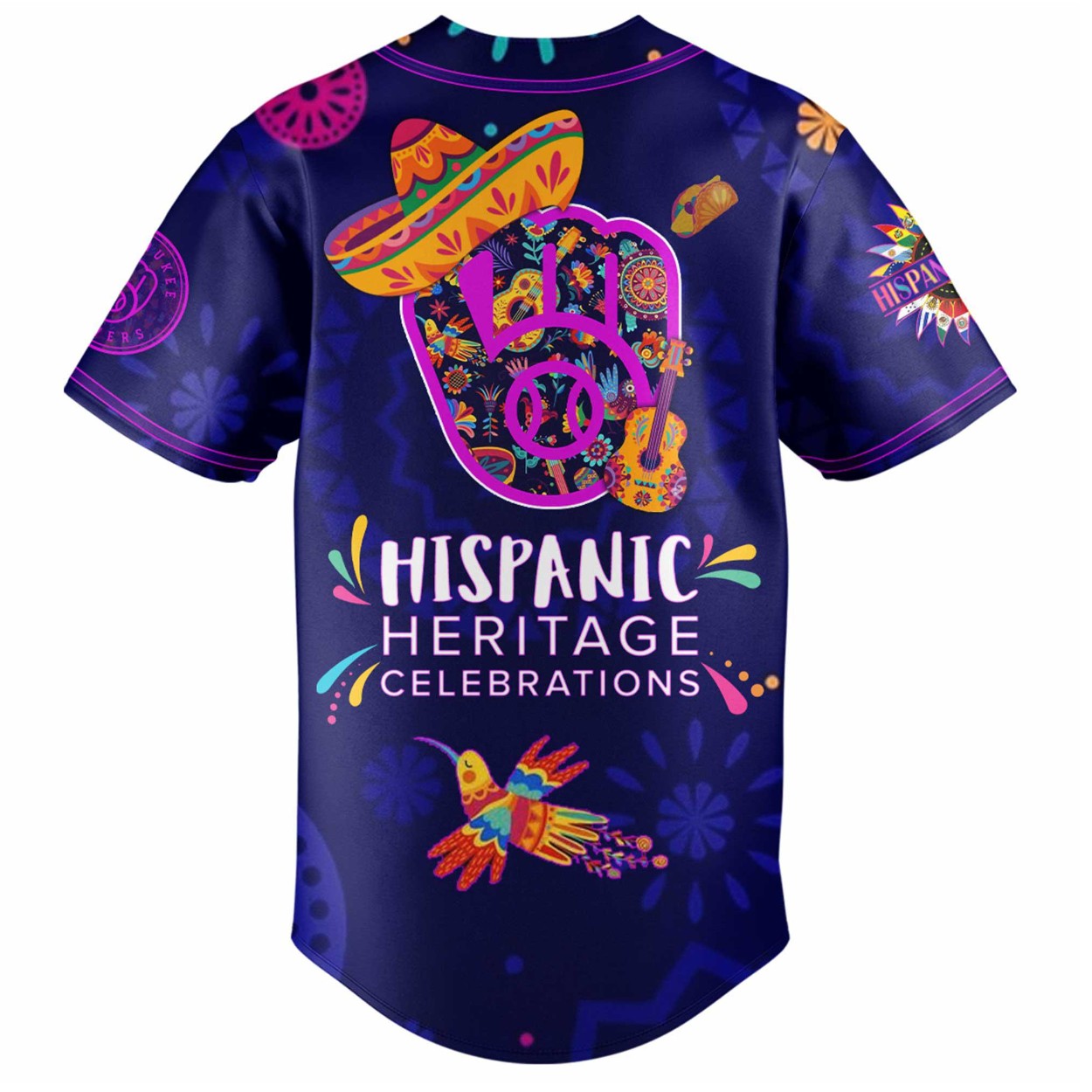 The jersey showcases a rich navy base with striking purple trim, adorned with intricate floral motifs, musical instruments, and a dynamic hummingbird graphic. The front displays the classic “Brewers” script, while the back proudly features “Hispanic Heritage Celebrations”. Each element reflects a tribute to Hispanic roots, making it a standout piece for any collection.