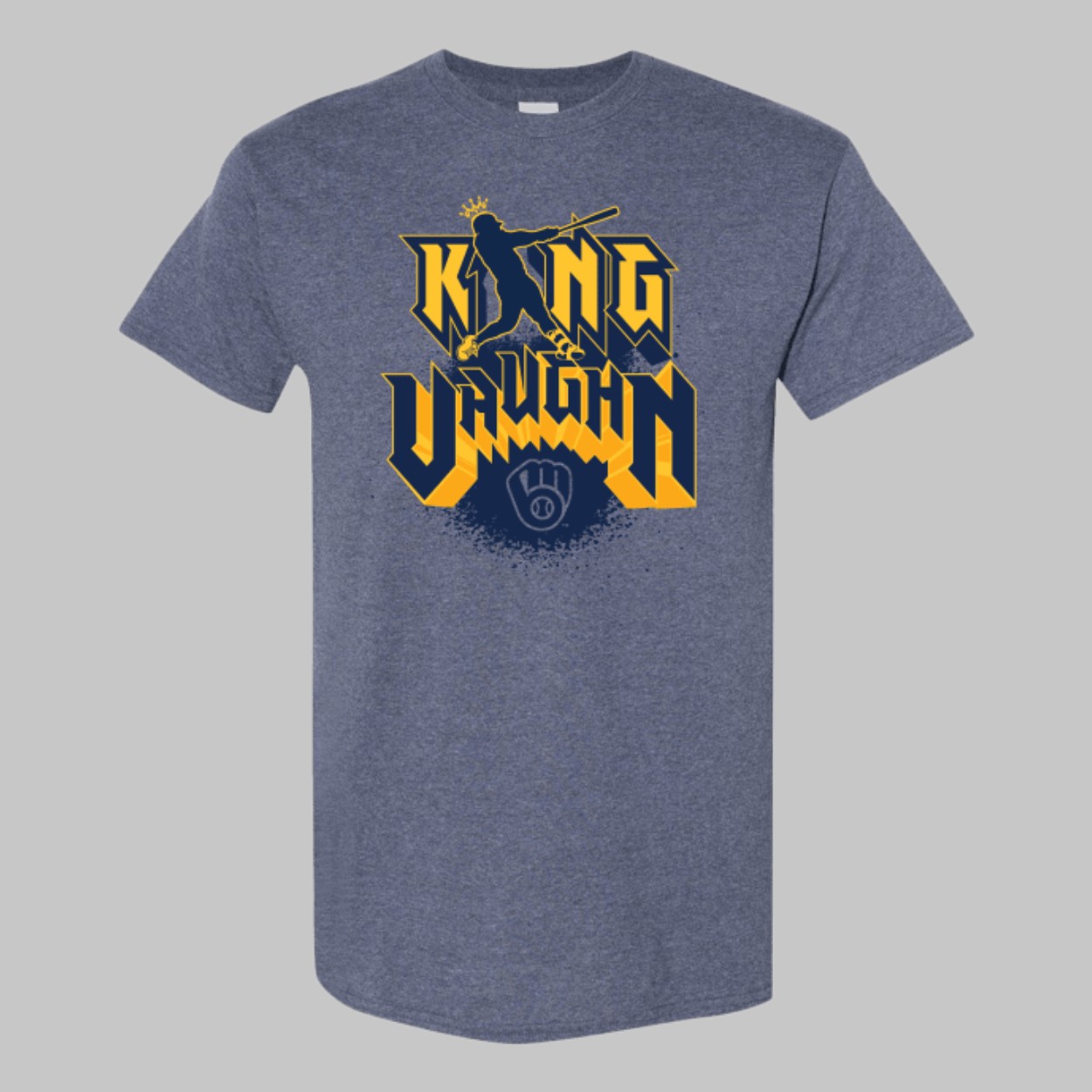 - This stunning t-shirt, available in sizes S to 5XL, features a bold design with a dynamic silhouette of “King Vaughn” swinging a bat, adorned with a regal crown and the iconic Brewers logo.