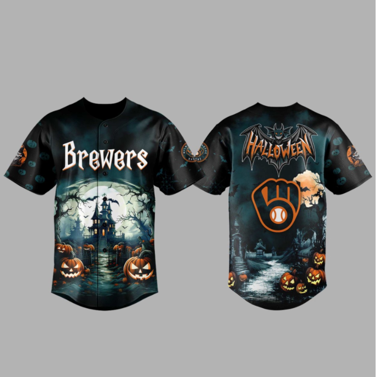 The front showcases a eerie haunted house beneath a full moon, surrounded by glowing jack-o’-lanterns and twisted trees, with the striking “Brewers” logo in a ghostly font. The back features the classic Brewers “M” glove logo, framed by a bat-winged Halloween design and more pumpkins, creating a thrilling yet stylish look. Subtle sleeve accents enhance the haunting vibe, making this a standout collector’s item.