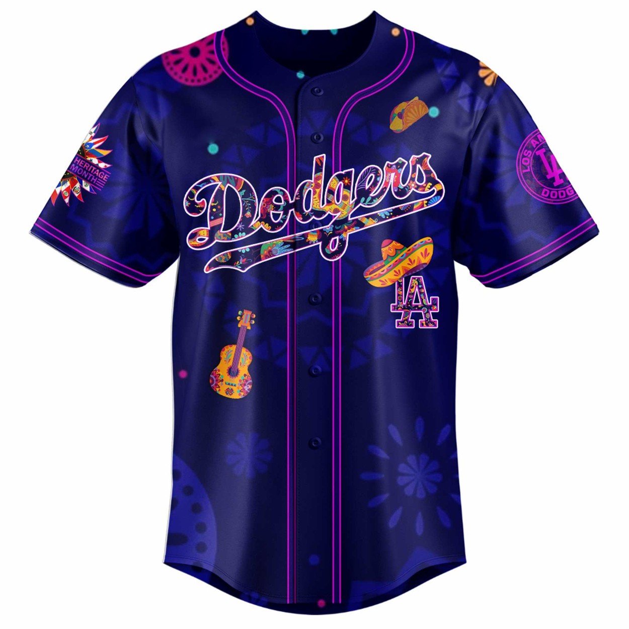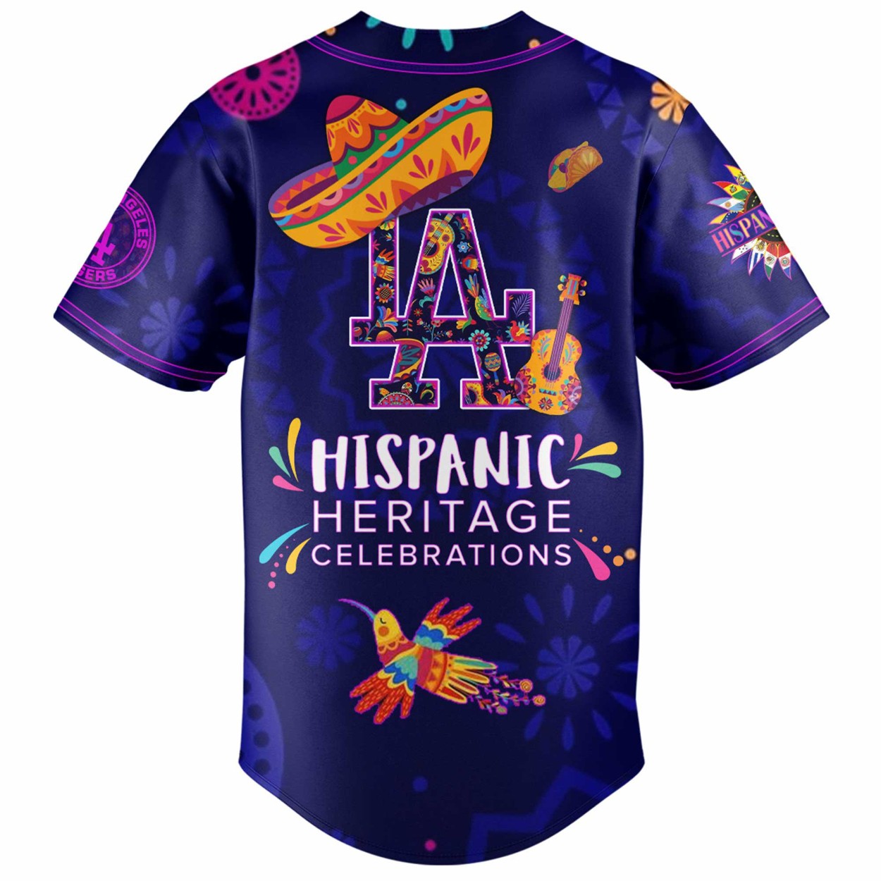 The jersey boasts a striking navy base with purple accents, adorned with floral designs, musical instruments, and bold “Hispanic Heritage Celebrations” text on the back. The front showcases the classic “Dodgers” script. Every detail reflects a tribute to Hispanic roots, making it a standout piece.
