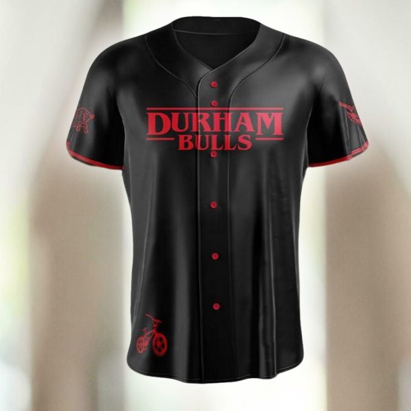 - The striking design features the “DURHAM BULLS” logo in a bold, Stranger Things-inspired font across the chest, set against a sleek black base with red accents.