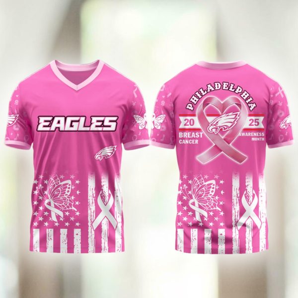 - Crafted from lightweight polyester, it showcases the Eagles logo and a heart-shaped ribbon on the back, marked “2025 Breast Cancer Awareness Month.”
