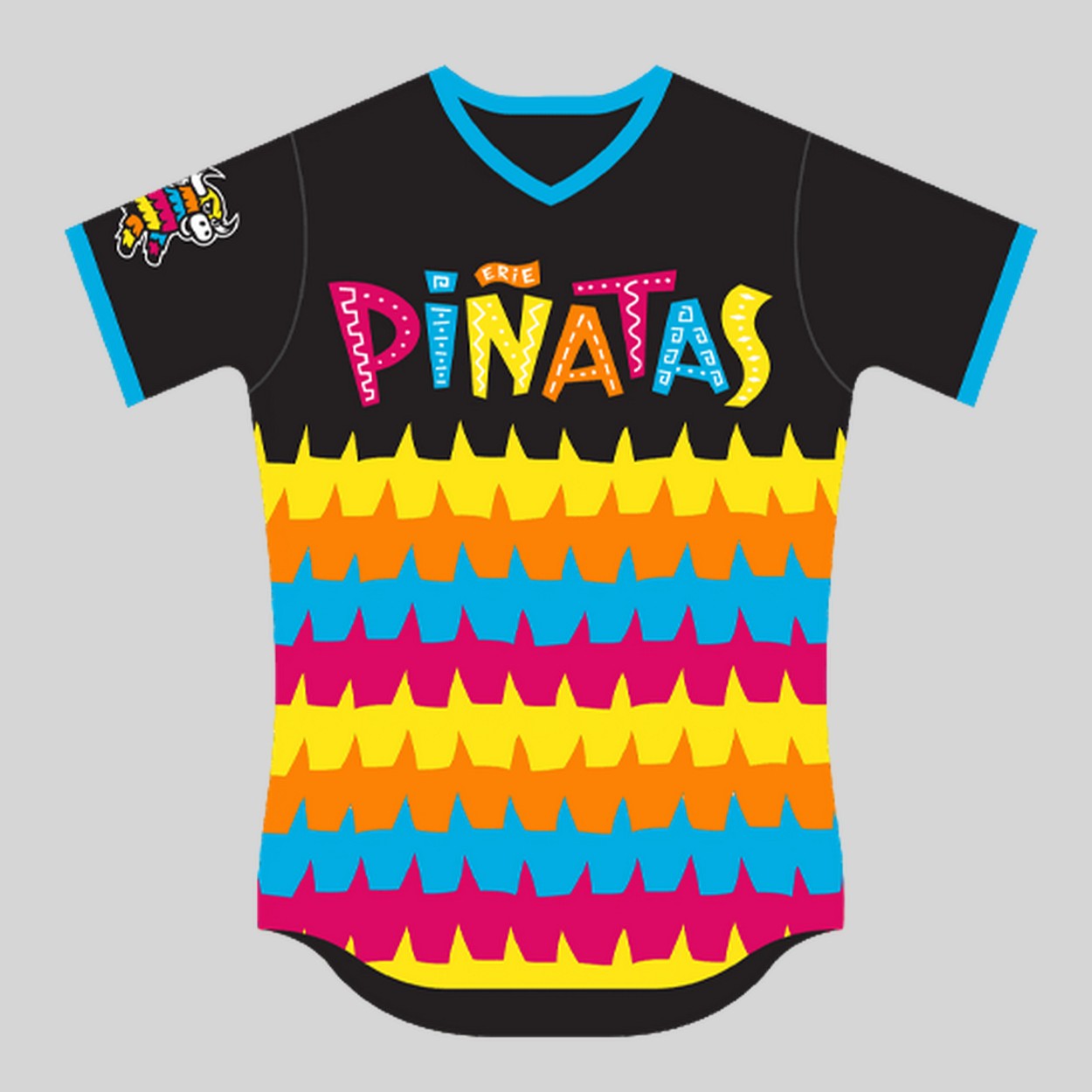 - The black base features a bold “Piñatas” logo in playful, multicolored letters, paired with a zigzag pattern in yellow, orange, pink, and blue.