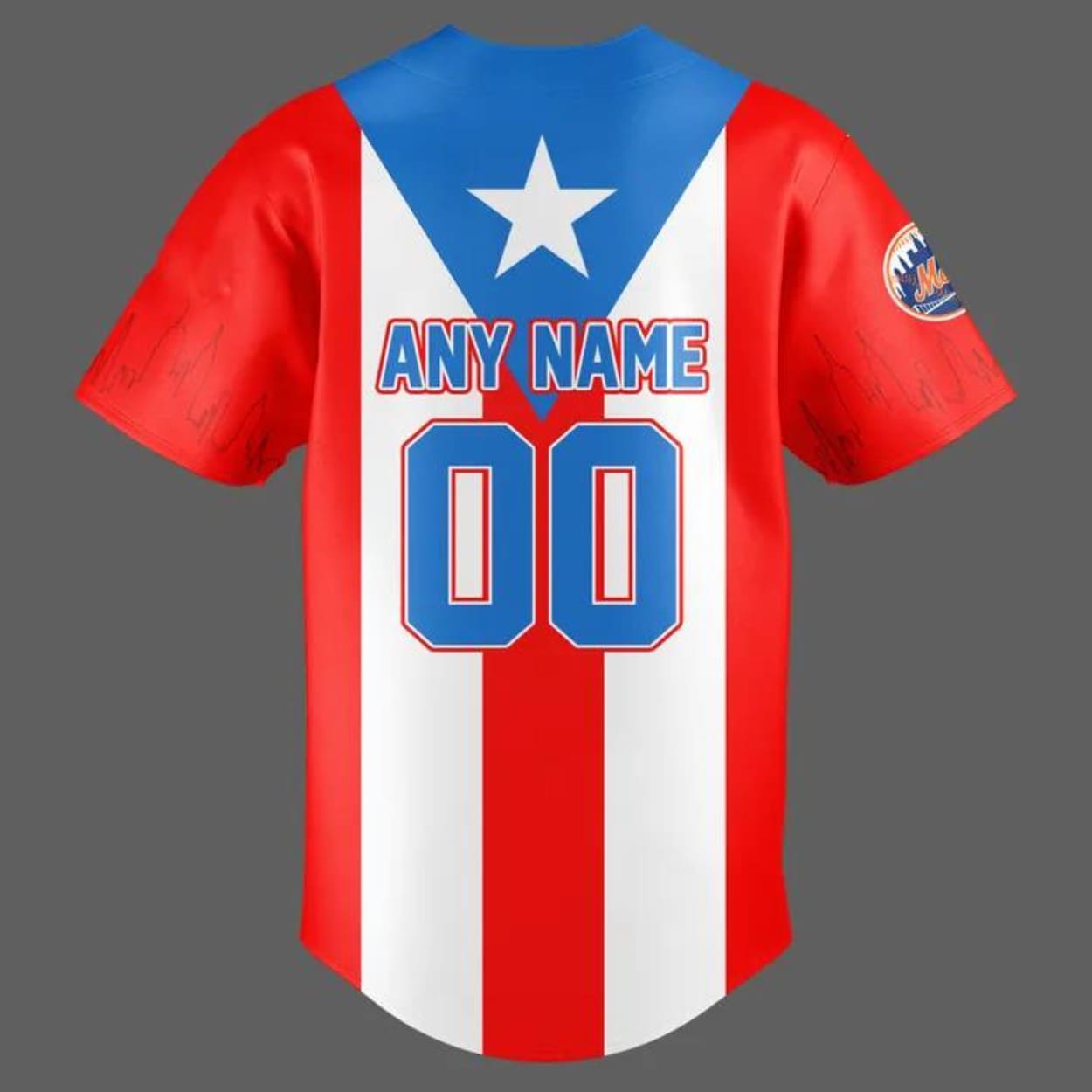 Design: Blue and orange jersey with “Los Mets,” Puerto Rican flag, and Taíno symbols.