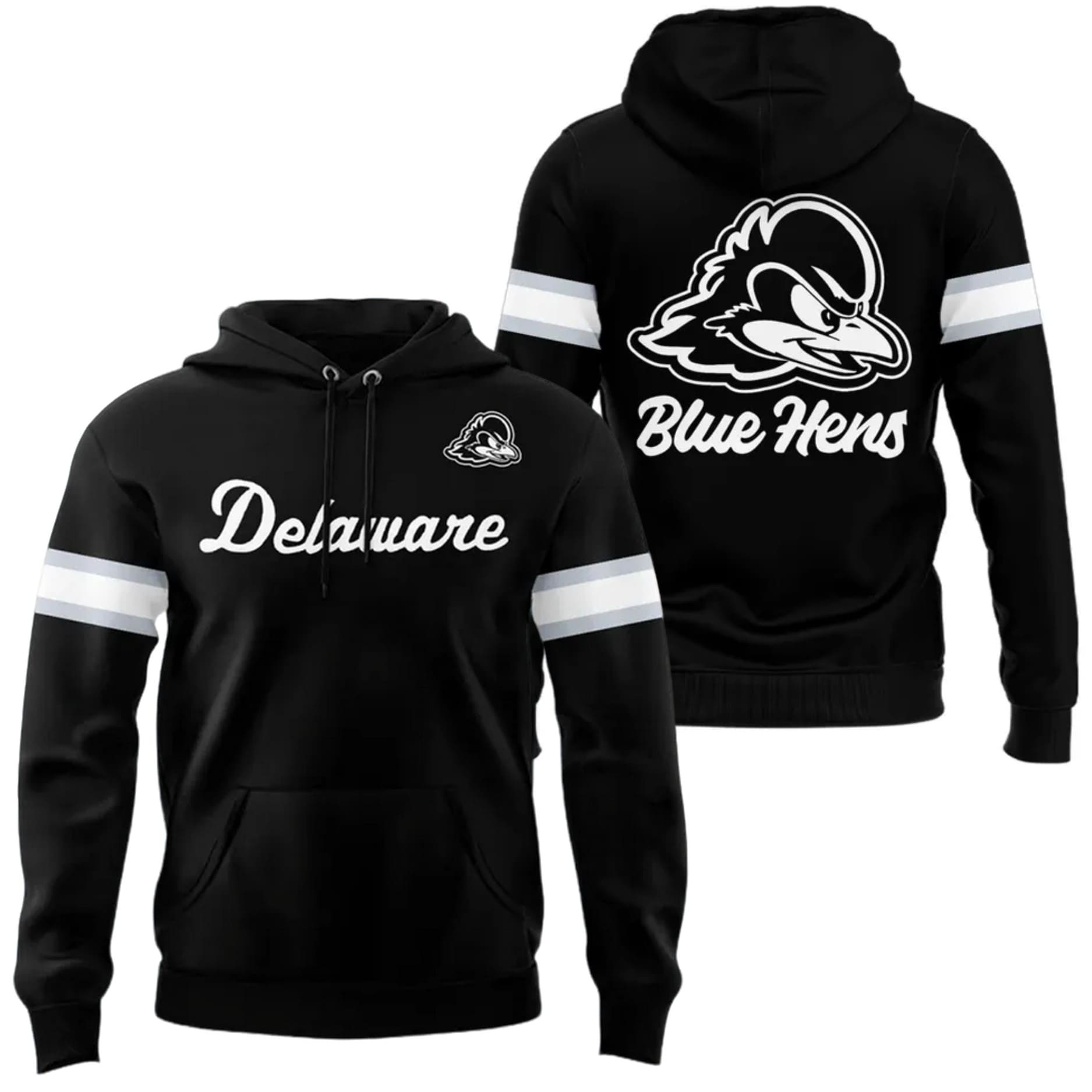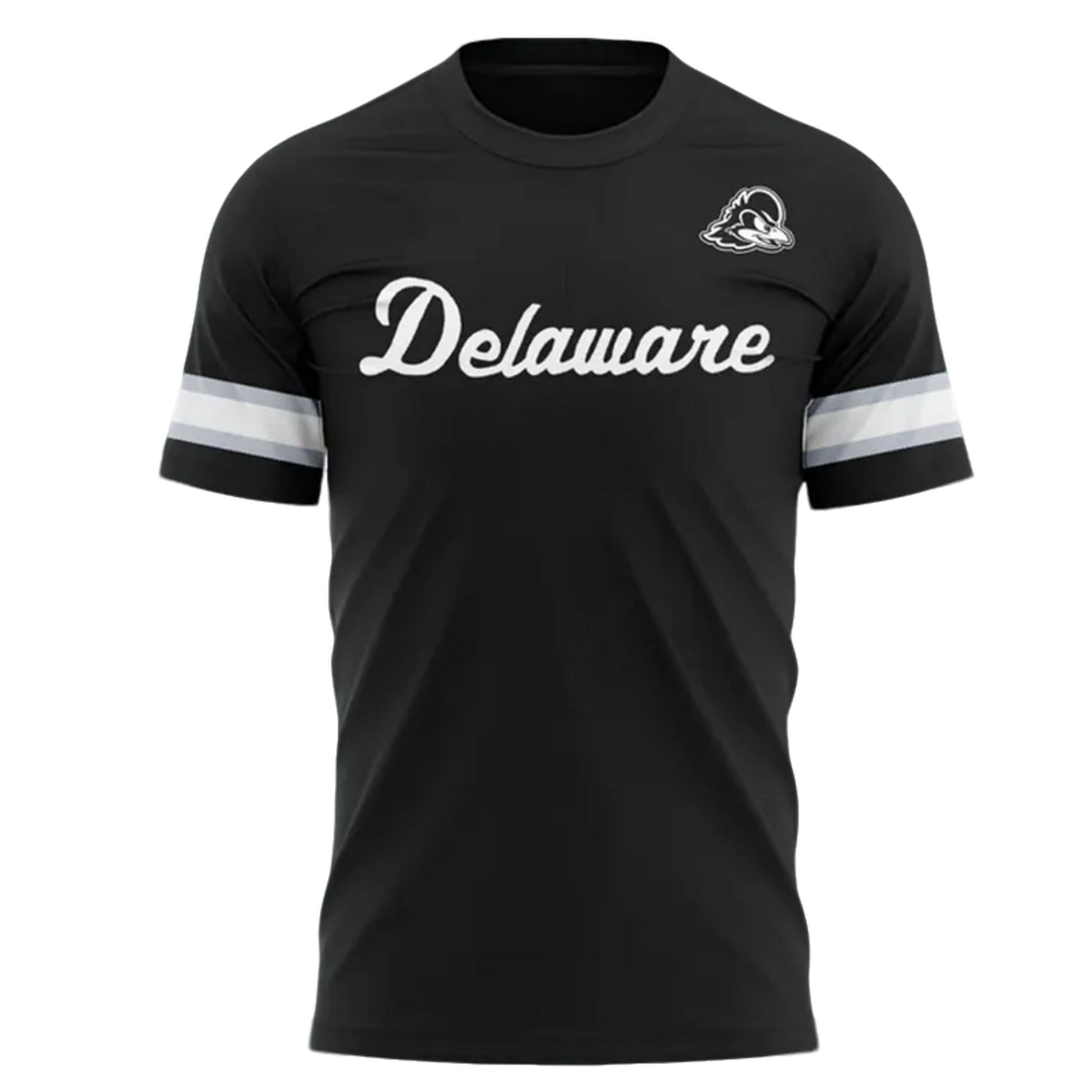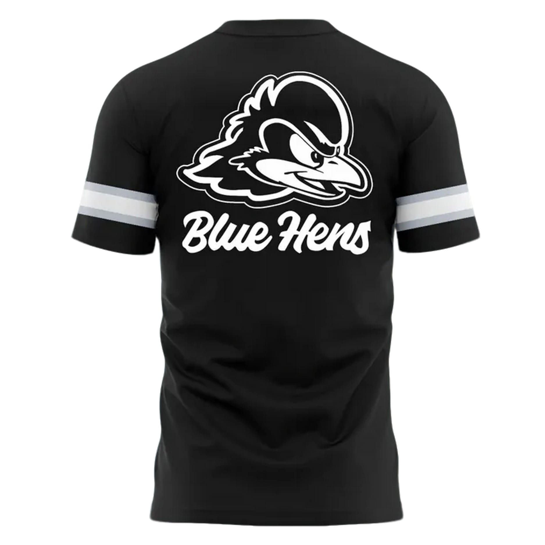 | Design Feature | Front: “Delaware” script + small Blue Hens logo. Back: Large Blue Hens logo + “Blue Hens” script. Sleeves: White & gray athletic stripes. |