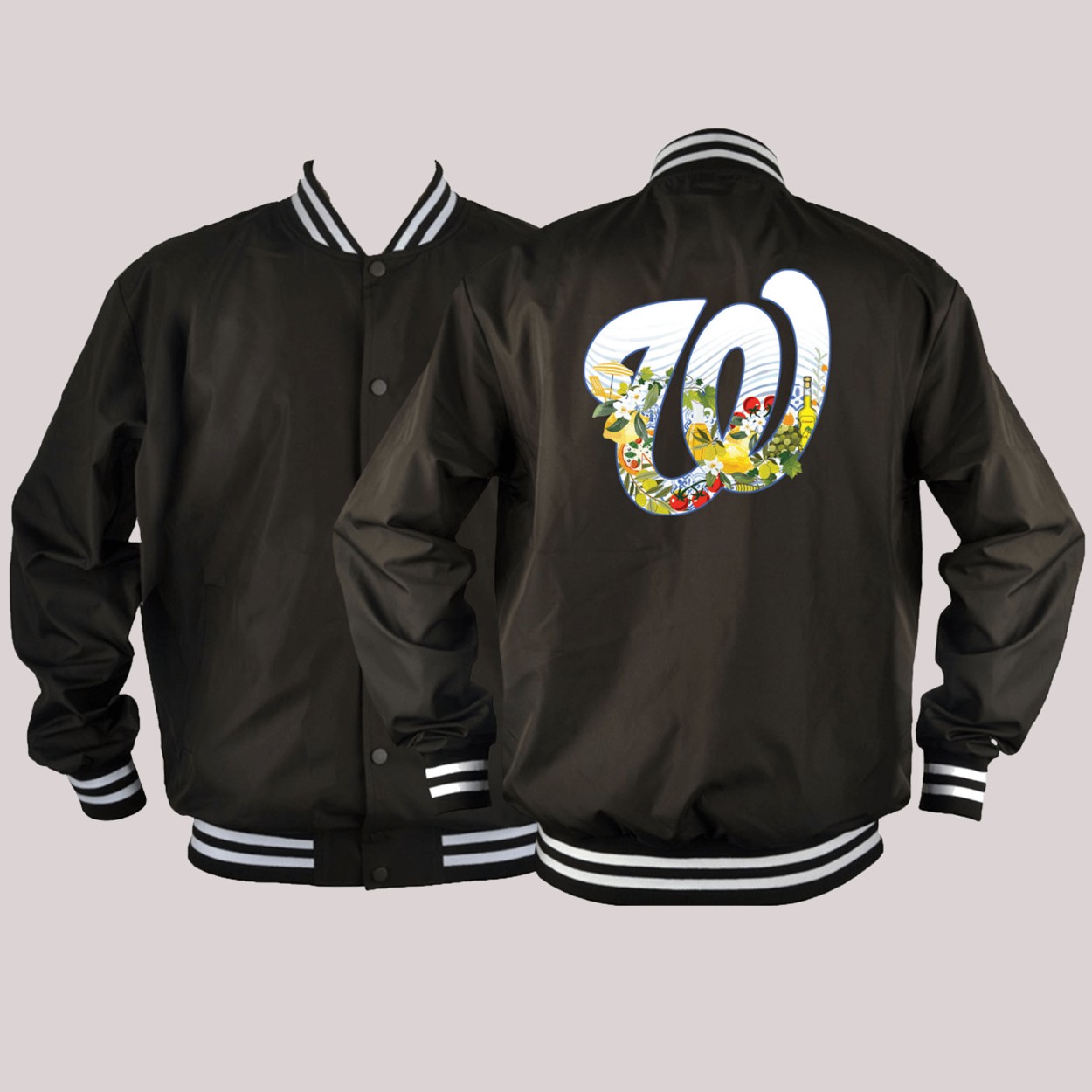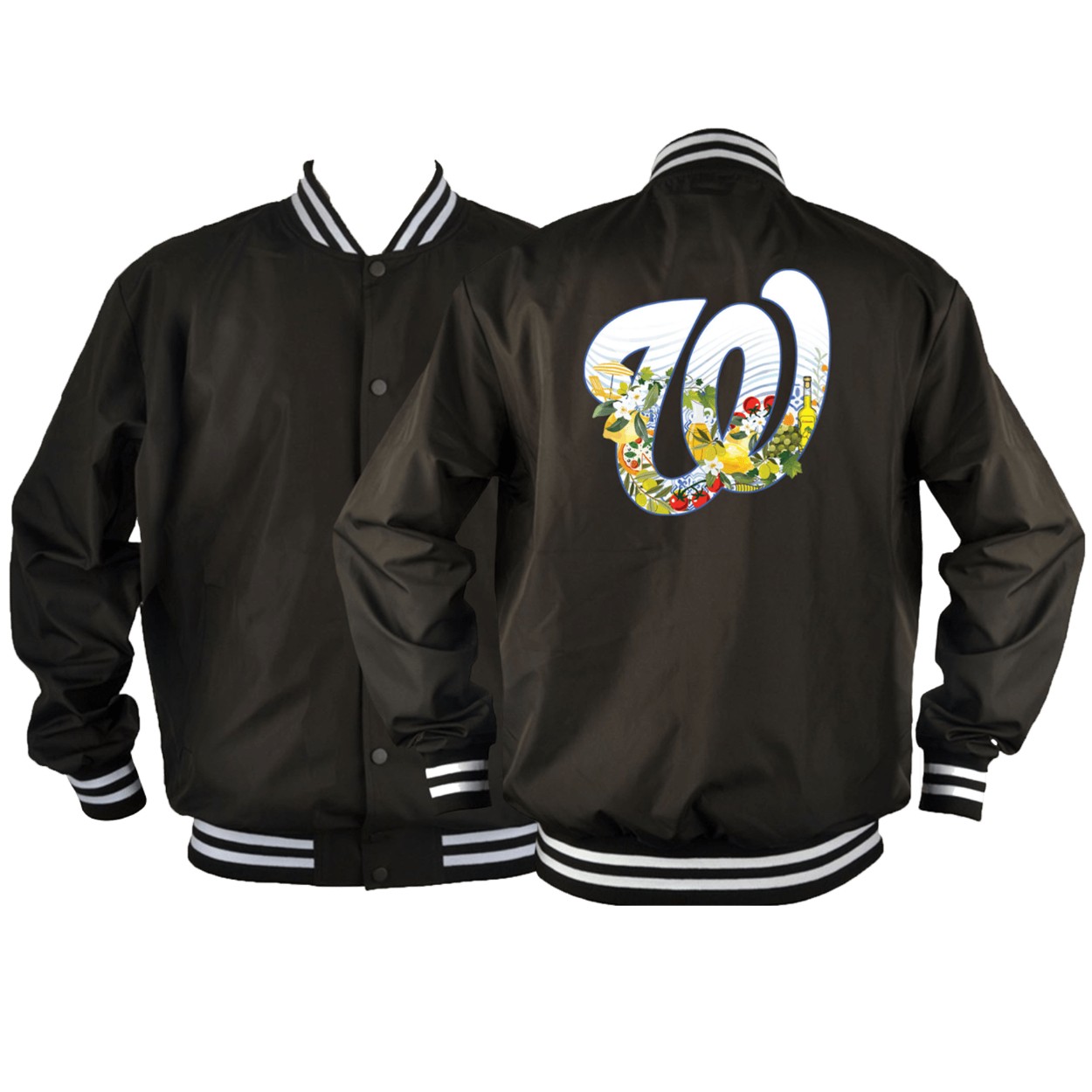 Step into style with the 2025 Nationals Italian Heritage Day Baseball Jacket Giveaway! This sleek black jacket, crafted from premium polyester, features a vibrant “W” logo adorned with colorful Italian-inspired elements like fruits, flowers, and wine on the back. Available in sizes S to 6XL, it’s designed for ultimate comfort and a perfect fit for every fan. The classic varsity style, with white striped cuffs and hem, celebrates Italian culture with a modern twist, making it a standout piece for any occasion.