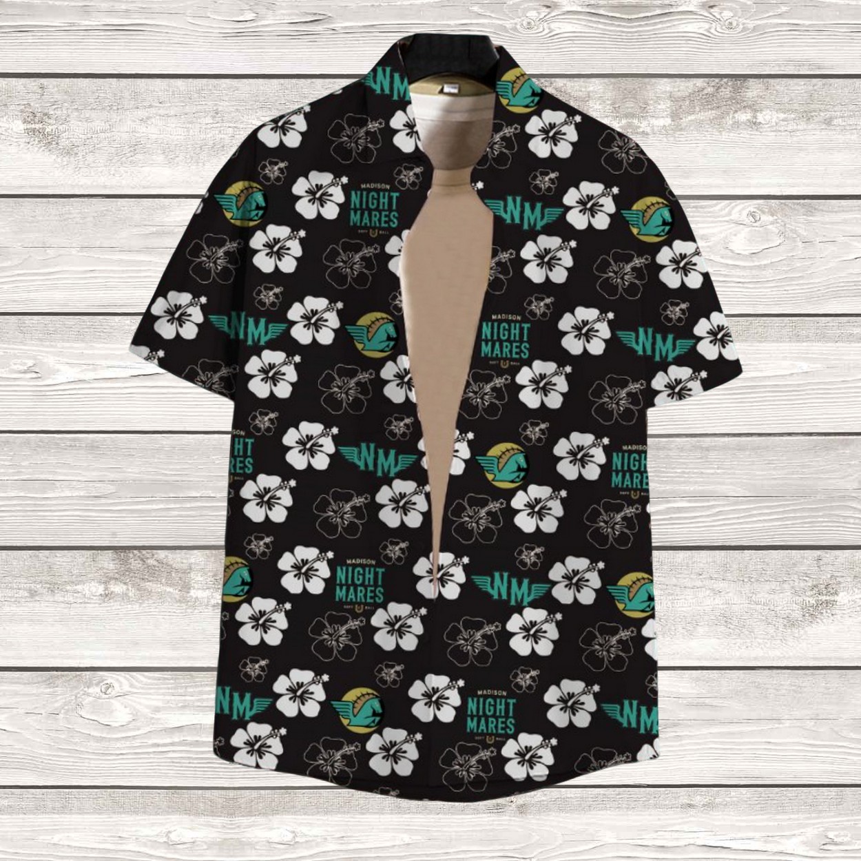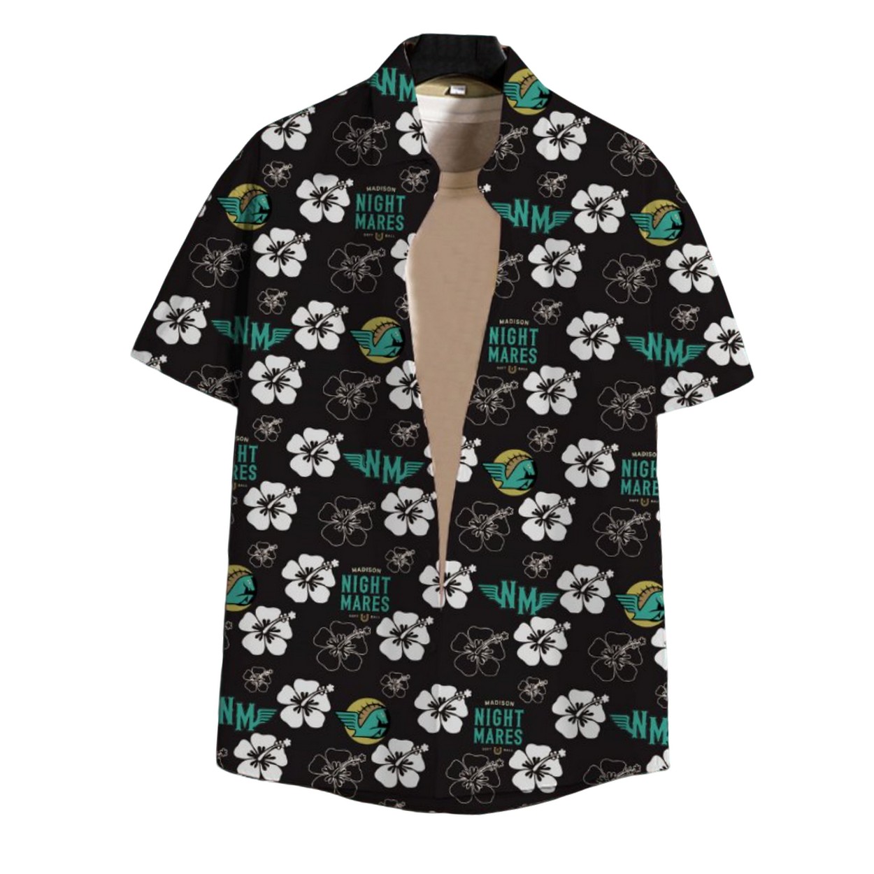 - Available in sizes S to 5XL, this striking black shirt features a vibrant tropical design with white hibiscus flowers, accented by the “Night Mares” logo and a teal seahorse emblem.