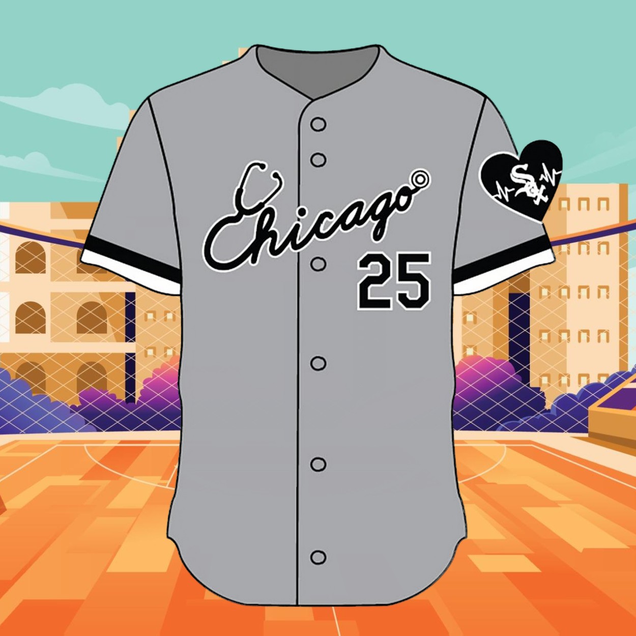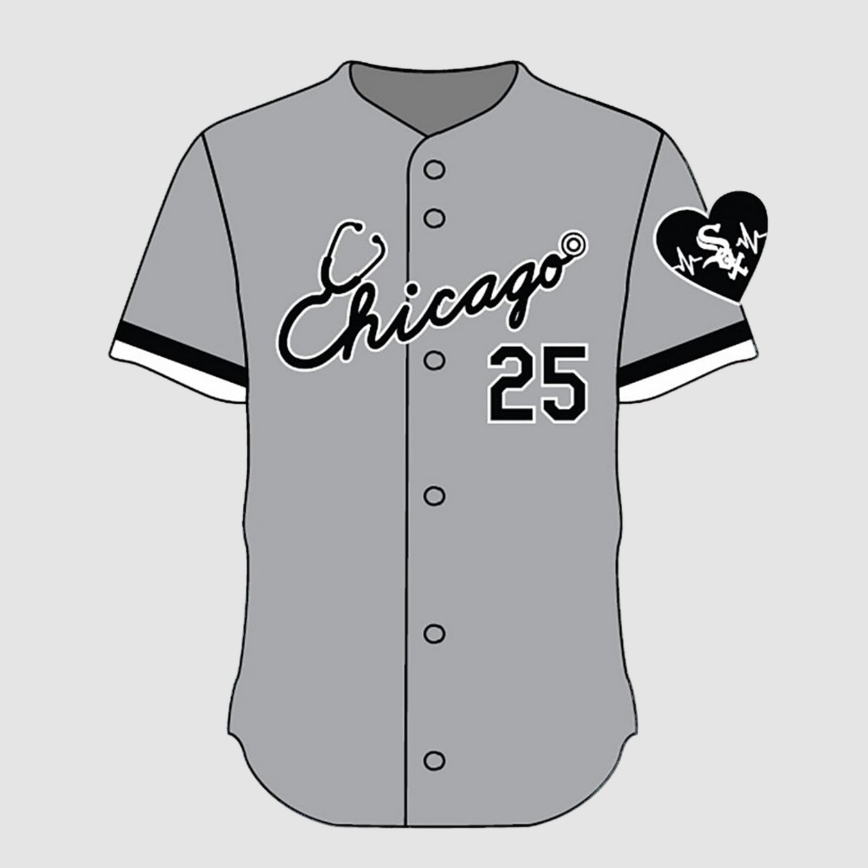 - A stethoscope graphic adds a heartfelt touch, while a heart-shaped White Sox logo on the sleeve symbolizes gratitude.