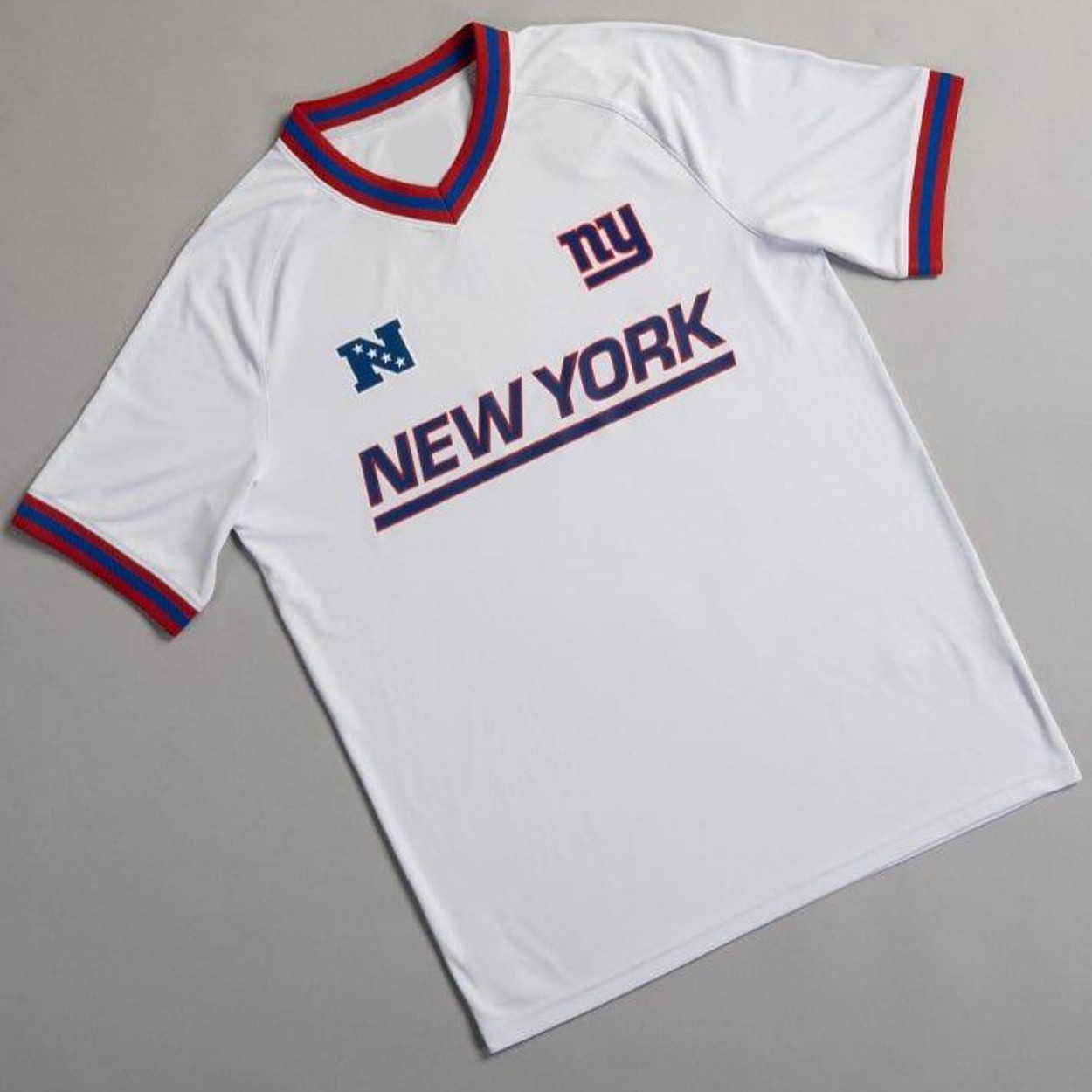 - The crisp white base is accented with the Giants’ iconic red and blue trim along the V-neck collar and sleeve cuffs, adding a bold pop of team color.