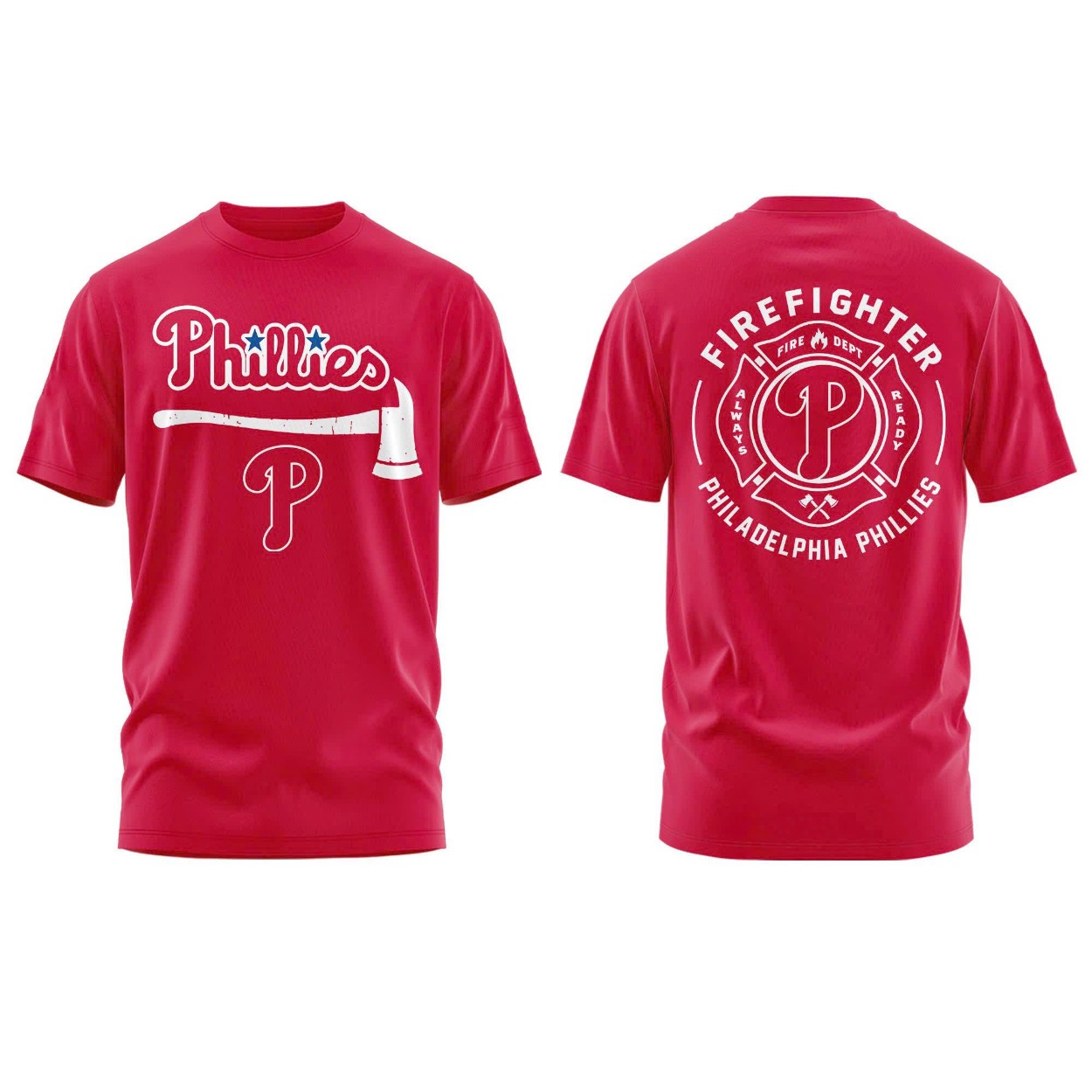 The back takes the theme even further with an intricate, custom-designed fire department-style shield badge. This circular graphic prominently features the Phillies ‘P’ logo at its center, surrounded by text that reads “FIREFIGHTER,” “FIRE DEPT,” “READY,” and the full team name “PHILADELPHIA PHILLIES.”