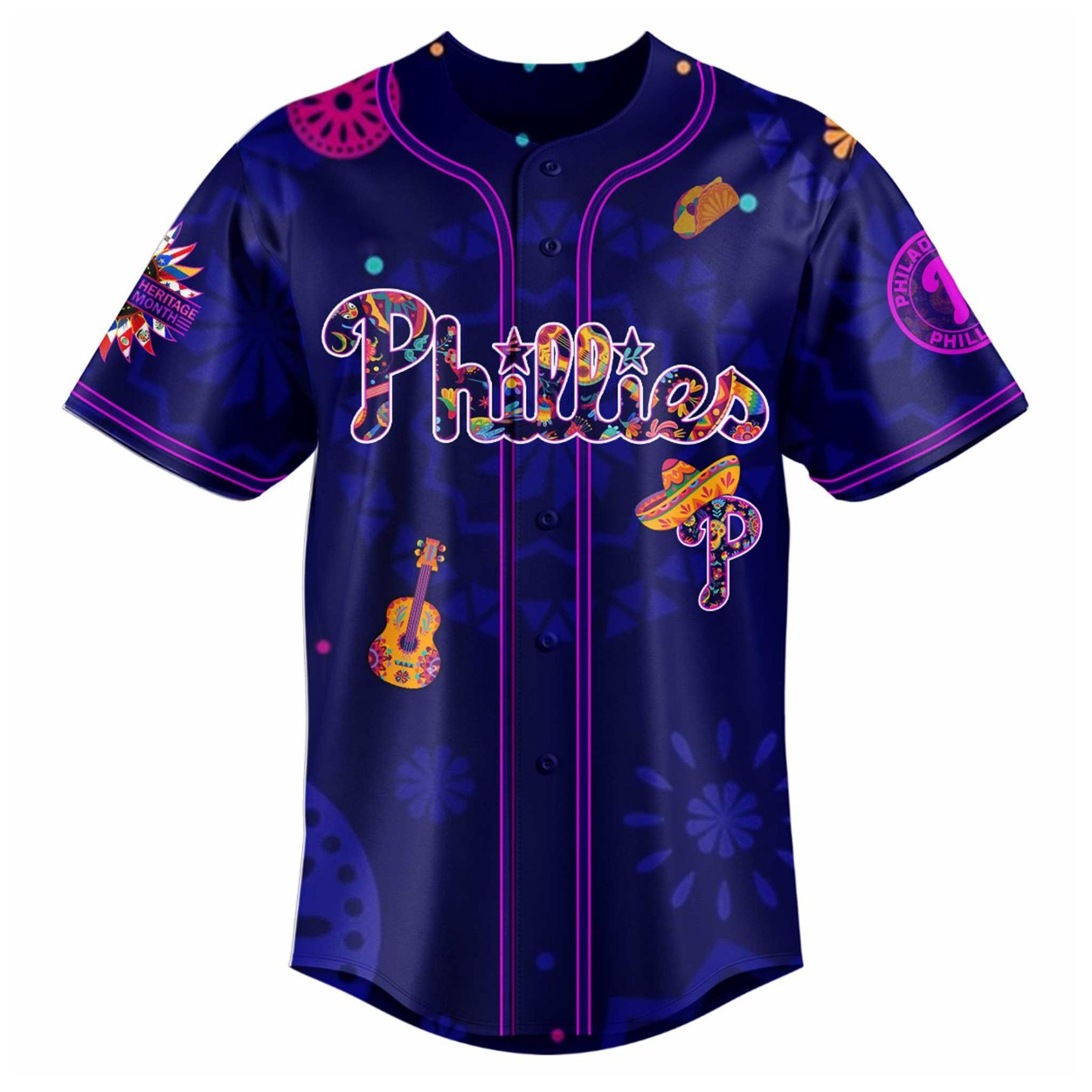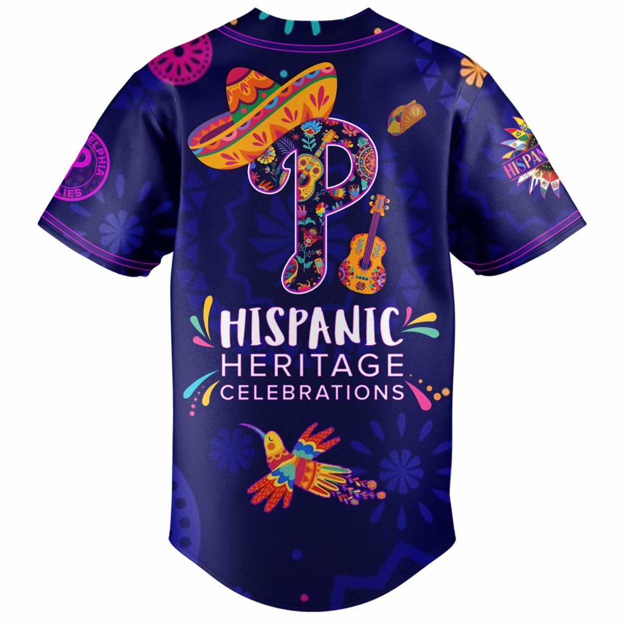 The jersey showcases a striking purple base with blue accents, adorned with intricate floral and bird motifs that dance across the fabric. The front proudly displays the “Phillies” script, while the back highlights “Hispanic Heritage Celebrations” with a vibrant artwork of traditional fiesta decorations. Custom details like the sombrero and guitar add a festive touch, making this commemorative piece a standout for any fan or collector.