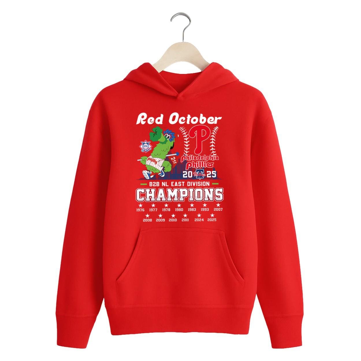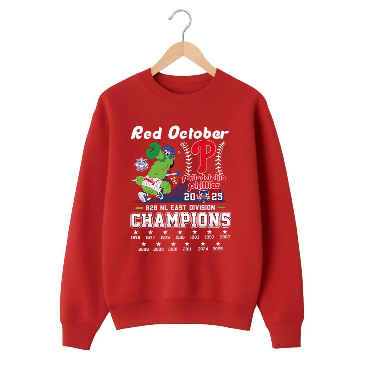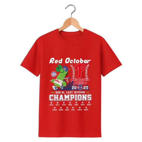 This vibrant red shirt captures the electric atmosphere of “Red October.” The design features a jubilant Phanatic, bat in hand, standing proudly next to the iconic Phillies “P” logo, which is intertwined with a baseball and the text “Philadelphia Phillies 2025.” Above, “Red October” sets the tone, while below, “B2B NL EAST DIVISION CHAMPIONS” declares their dominance. A historical timeline of all Phillies’ NL East titles, including the triumphant 2024 and 2025 seasons, is prominently displayed. It’s the perfect way to commemorate consecutive championships!