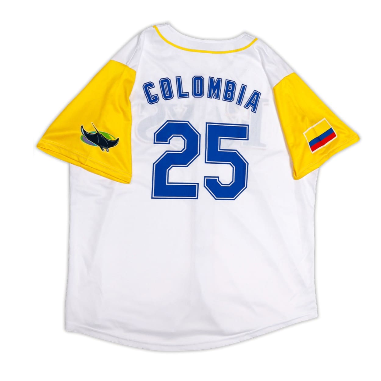 Design Details: The front features a colorful “RAYS” logo printed across the chest with yellow piping along the button placket. “COLOMBIA” and the number 25 are printed in bold blue on the back. Yellow sleeves with the Colombian flag and the signature stingray icon.