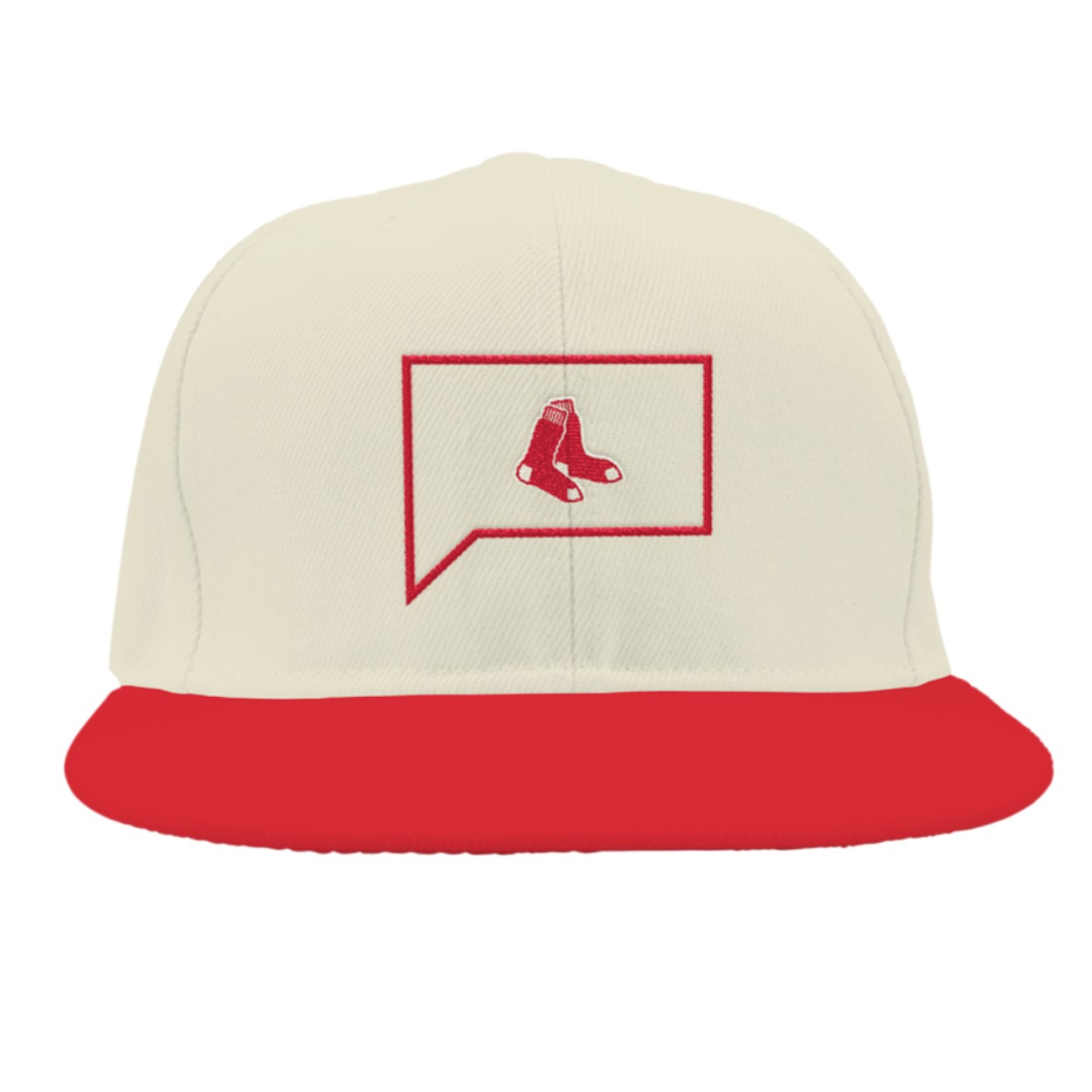 Featuring a cream crown and vibrant red bill, this hat showcases a bold embroidered logo of the Red Sox’s legendary socks within a red-outlined speech bubble. The minimalist yet striking design reflects the team’s rich history and passionate fanbase, offering a unique twist that sets it apart from traditional caps.
