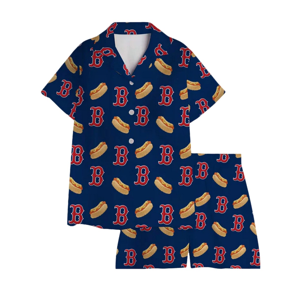 - The pajamas boast a vibrant navy background adorned with red “B” logos and scattered hot dog illustrations, blending team pride with a quirky touch.