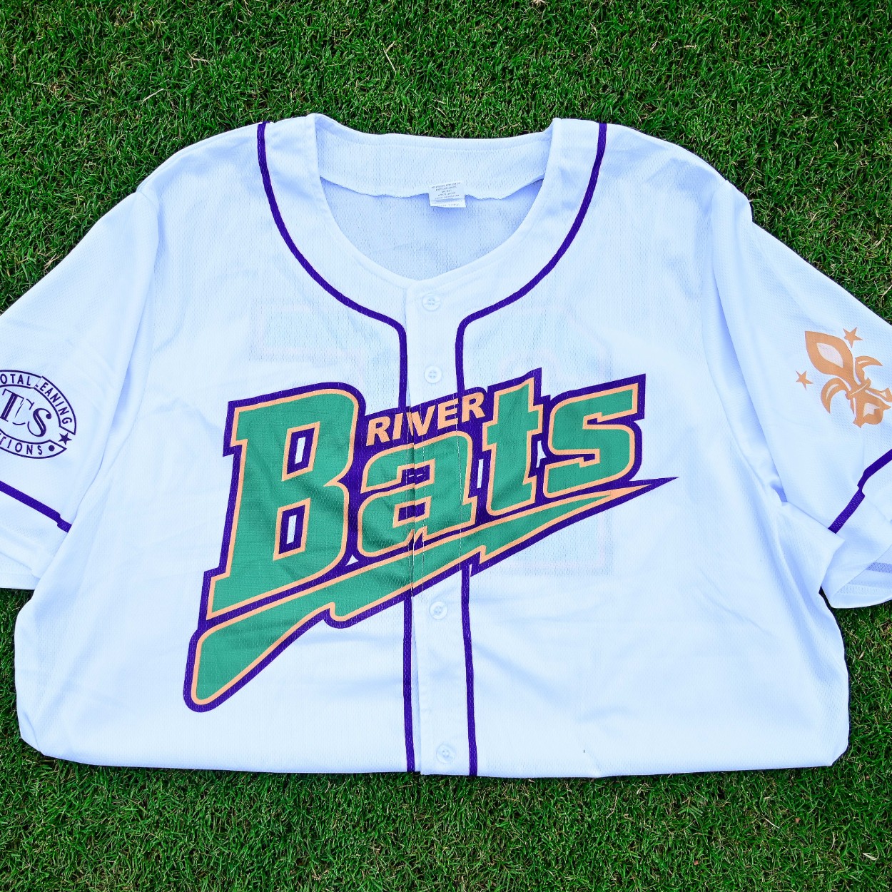 - This jersey boasts a dynamic design with the “RiverBats” name in a striking green and purple font, complemented by a subtle orange fleur-de-lis on the sleeve, symbolizing team heritage.