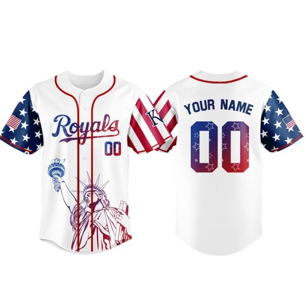 - Design Details: A classic Royals color scheme enhanced with a star-spangled sleeve, flag patches, and an Independence Day tribute on the front. The back features customizable name and number options, making it a unique addition to any fan’s collection.