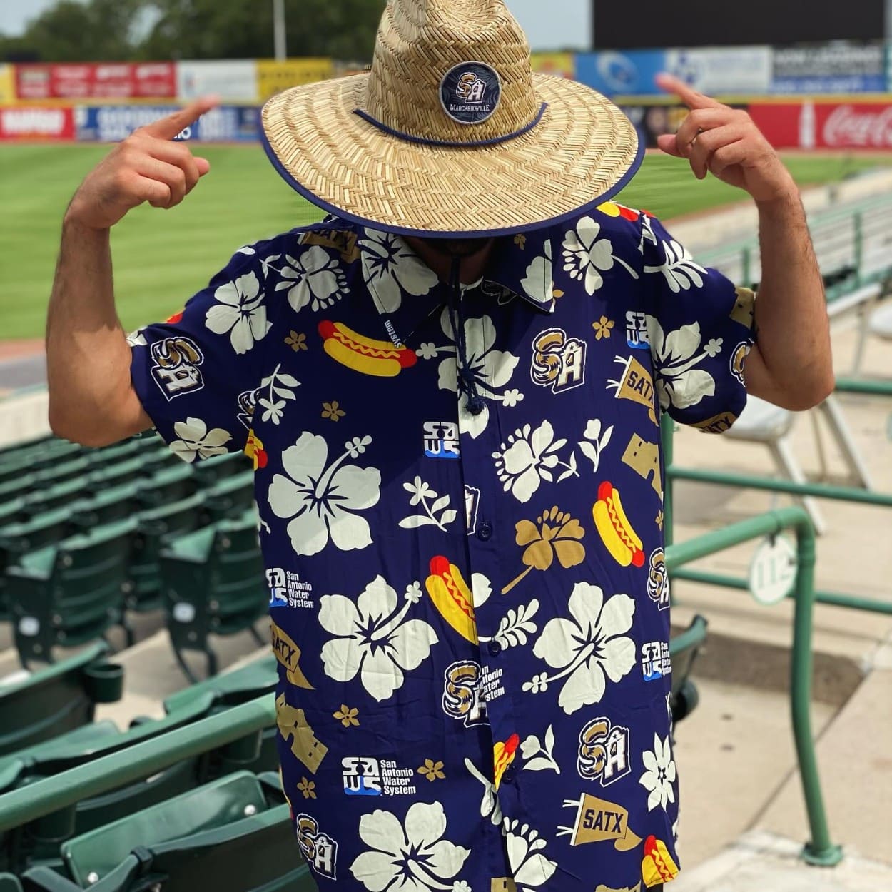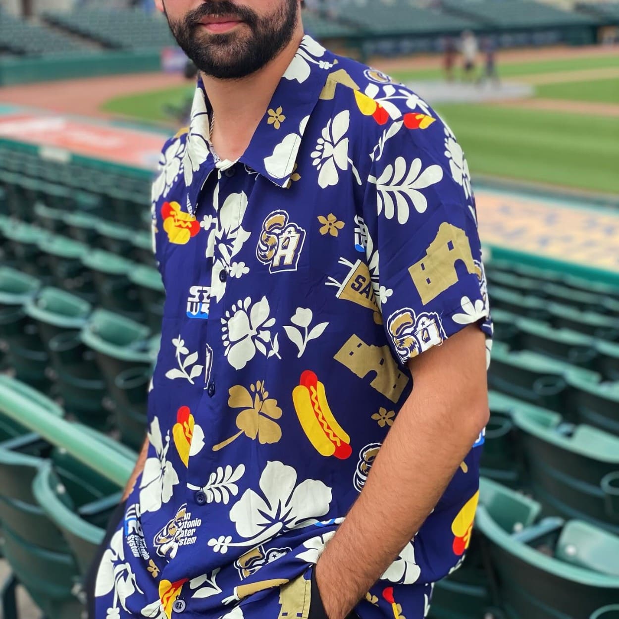 - Festive Design: Features a navy blue base with white hibiscus flowers, hot dogs, the Alamo, and “SA” and “SATX” logos, celebrating San Antonio’s culture and the SA Missions.