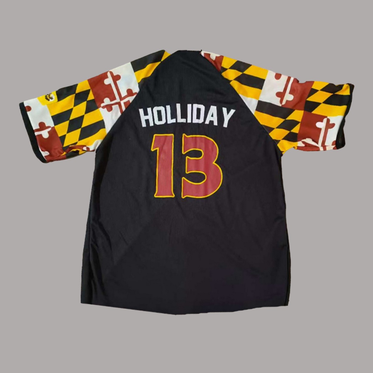 - This striking jersey features a bold black base with vibrant Maryland flag patterns on the sleeves, crafted from premium polyester and available in sizes S to 6XL.