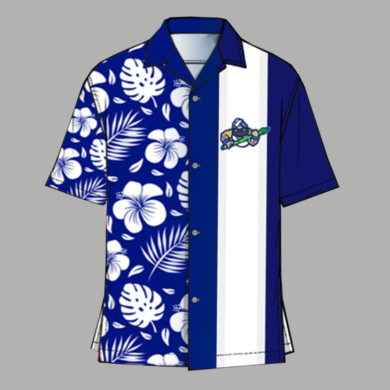 - This shirt showcases a unique design with a tropical floral print on the left, a clean white stripe down the middle, and a navy right side featuring Ports mascot wielding a bat.