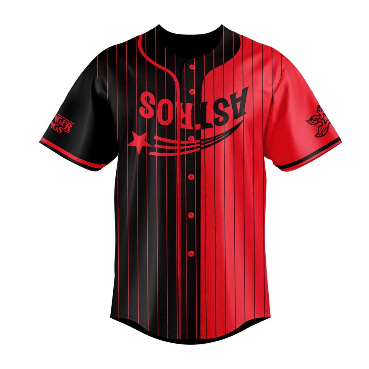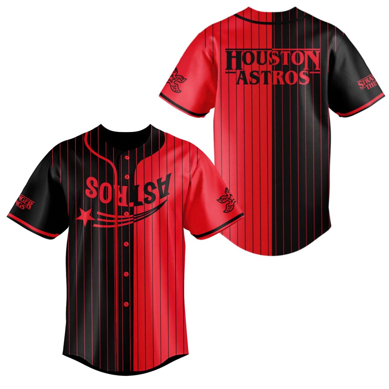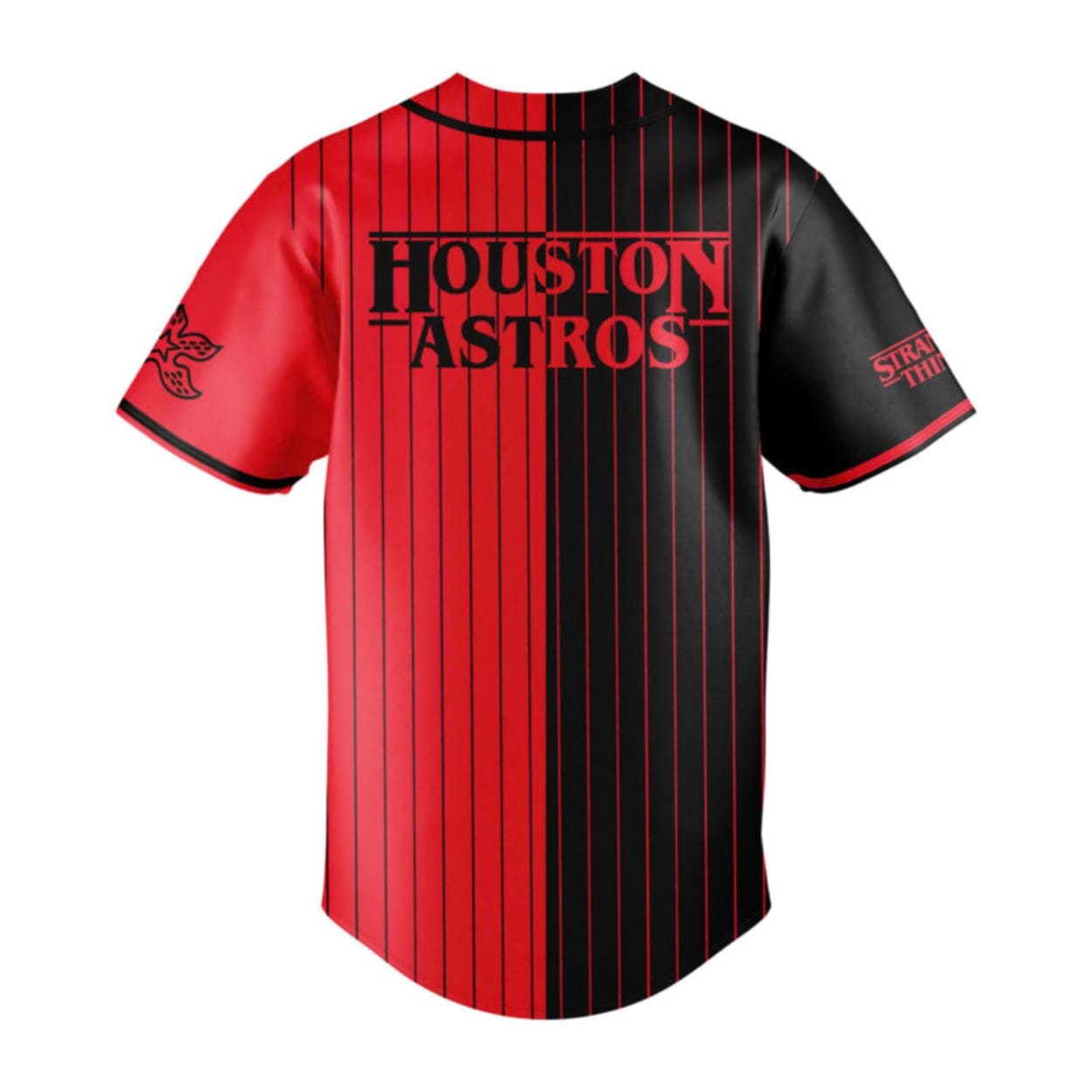 - Iconic Design: Features a red-and-black split with “ASTROS” and a star on the front, “HOUSTON ASTROS” on the back, plus Stranger Things on the sleeves.