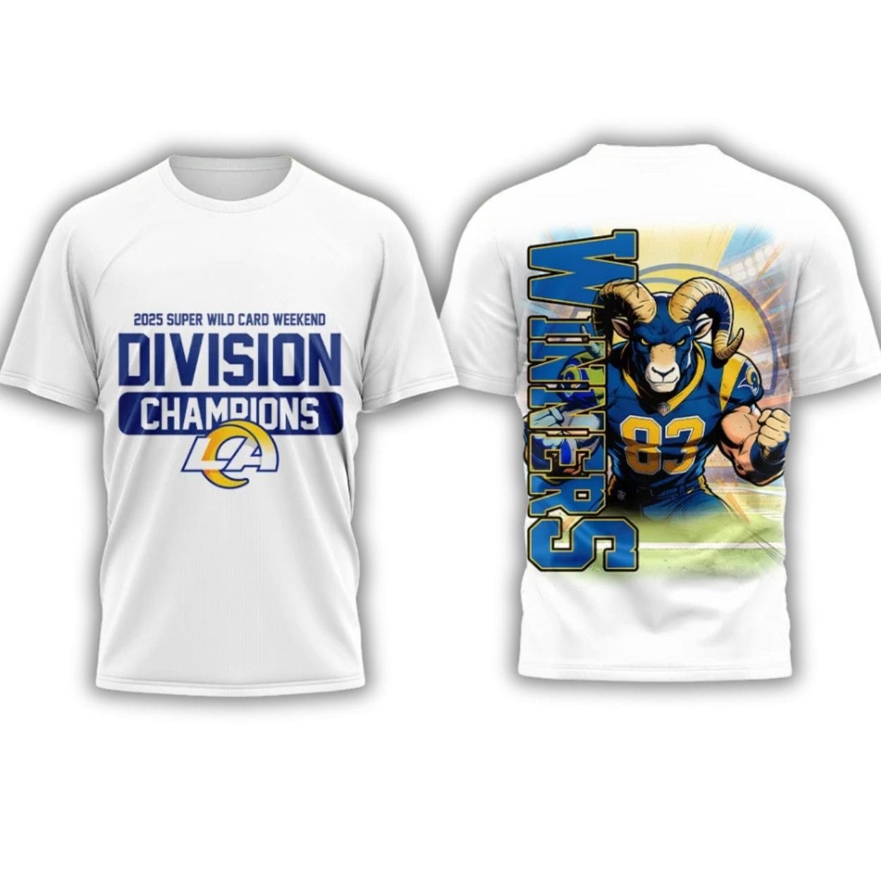 The front features the “2025 Super Wild Card Weekend Division Champions” branding alongside the iconic LA Rams logo.