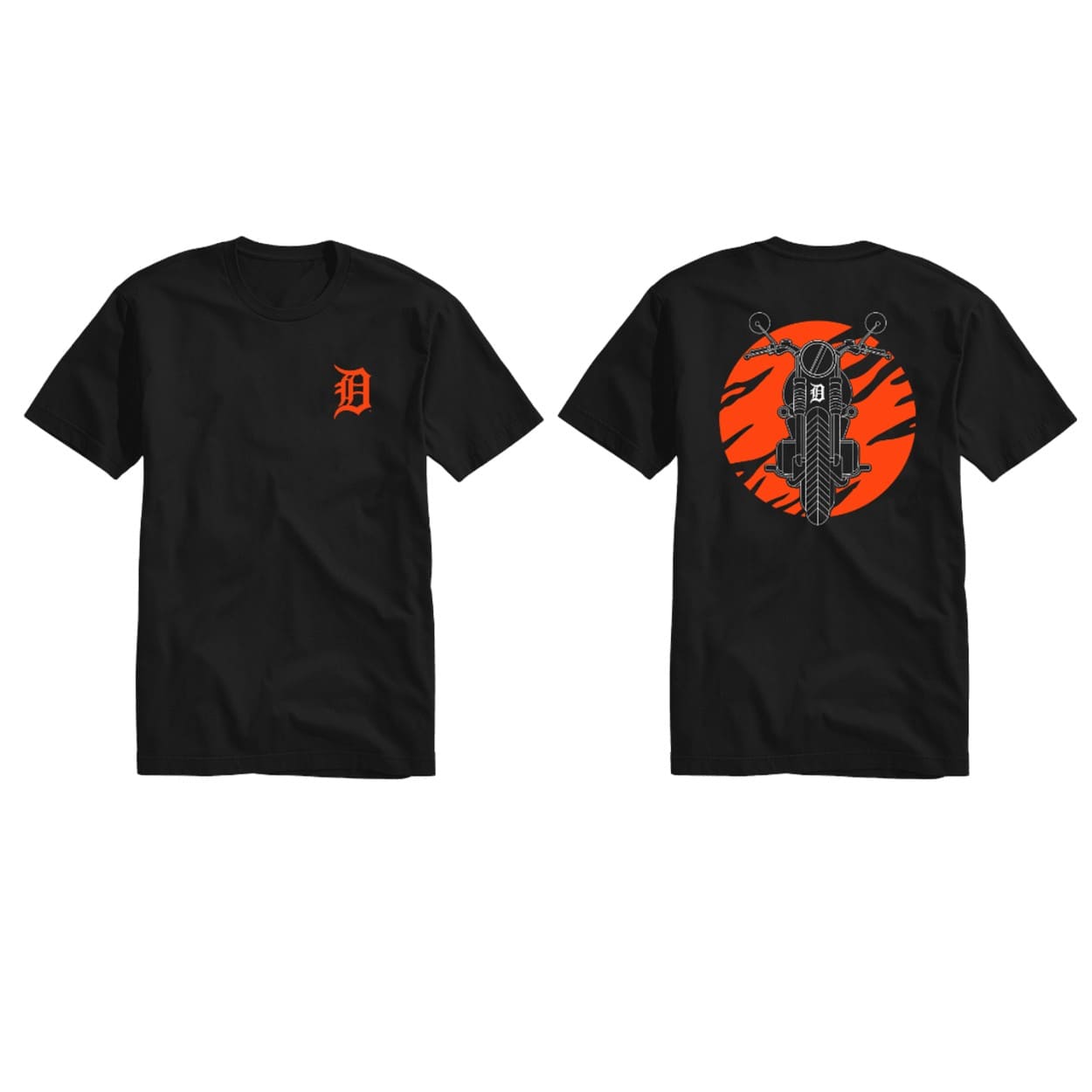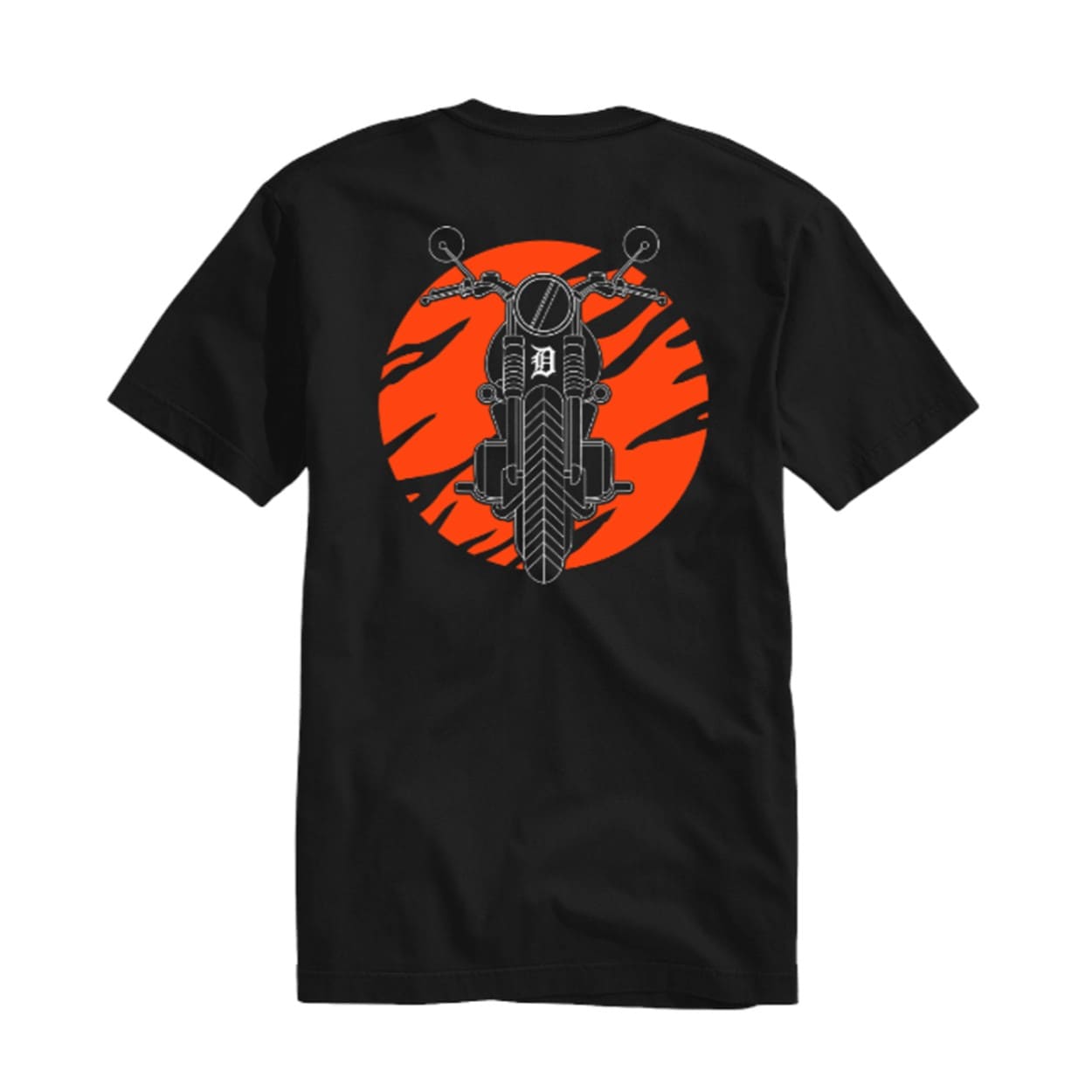 Design: Features a bold “D” logo on the front and a motorcycle with orange tiger stripes on the back.