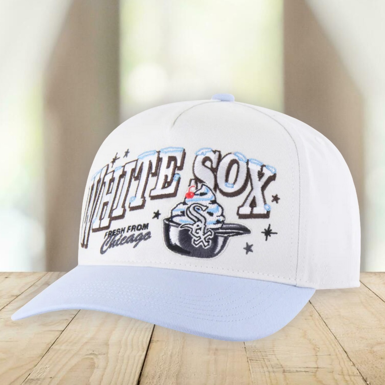 - The cap showcases a playful ice cream theme with the iconic White Sox logo, bold “WHITE SOX” lettering, and “Fresh From Chicago” text, accented with stars for a fun, summery vibe.