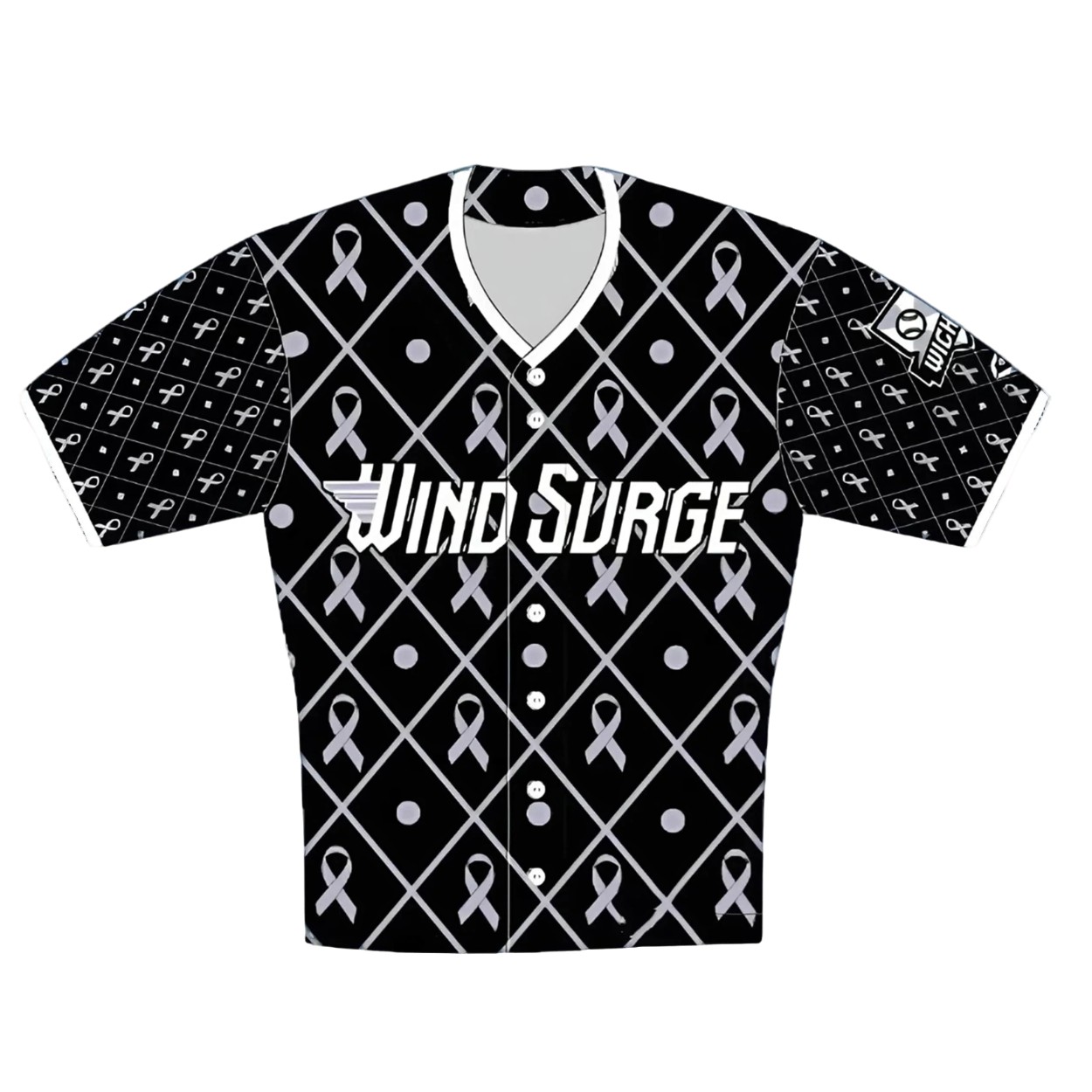 - Featuring a striking black base with a diamond pattern, it showcases silver awareness ribbons and the bold “Wind Surge” logo across the chest.