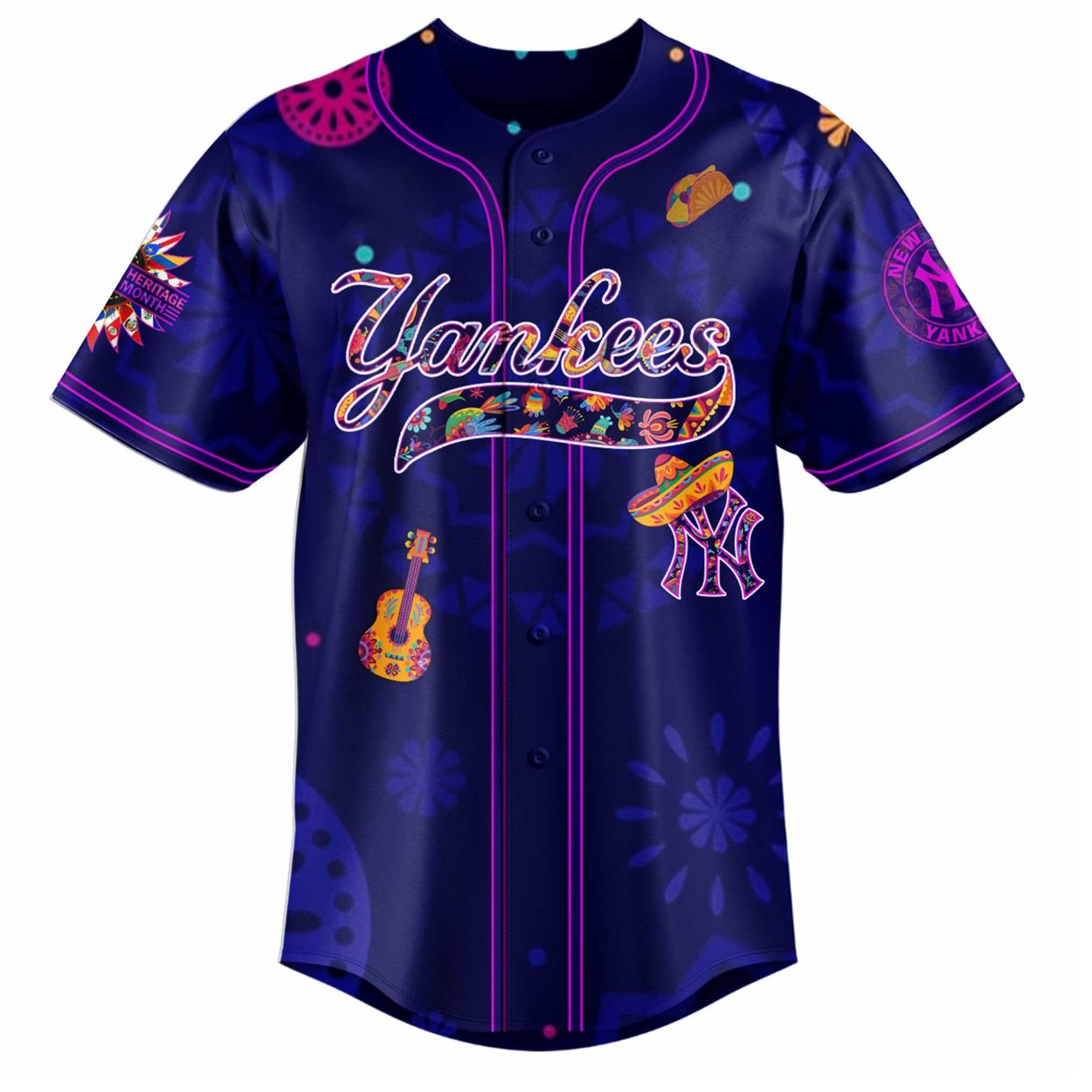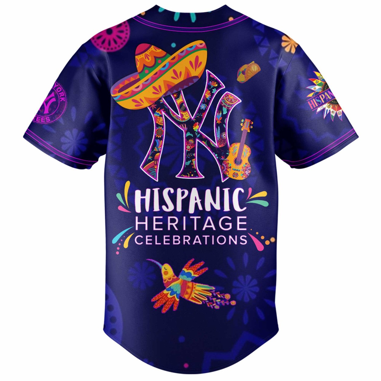 Step into the vibrant spirit of Hispanic Heritage with the 2025 Yankees Hispanic Heritage Celebrations Jersey! This stunning jersey blends the iconic NY Yankees style with colorful, culturally rich designs, featuring sombrero motifs, guitars, and a striking hummingbird emblem. Available in sizes S to 6XL, it’s crafted from high-quality polyester, ensuring durability and comfort for game days or casual wear. The bold purple and blue palette, adorned with intricate patterns, celebrates diversity and pride, making it a standout piece for any fan.