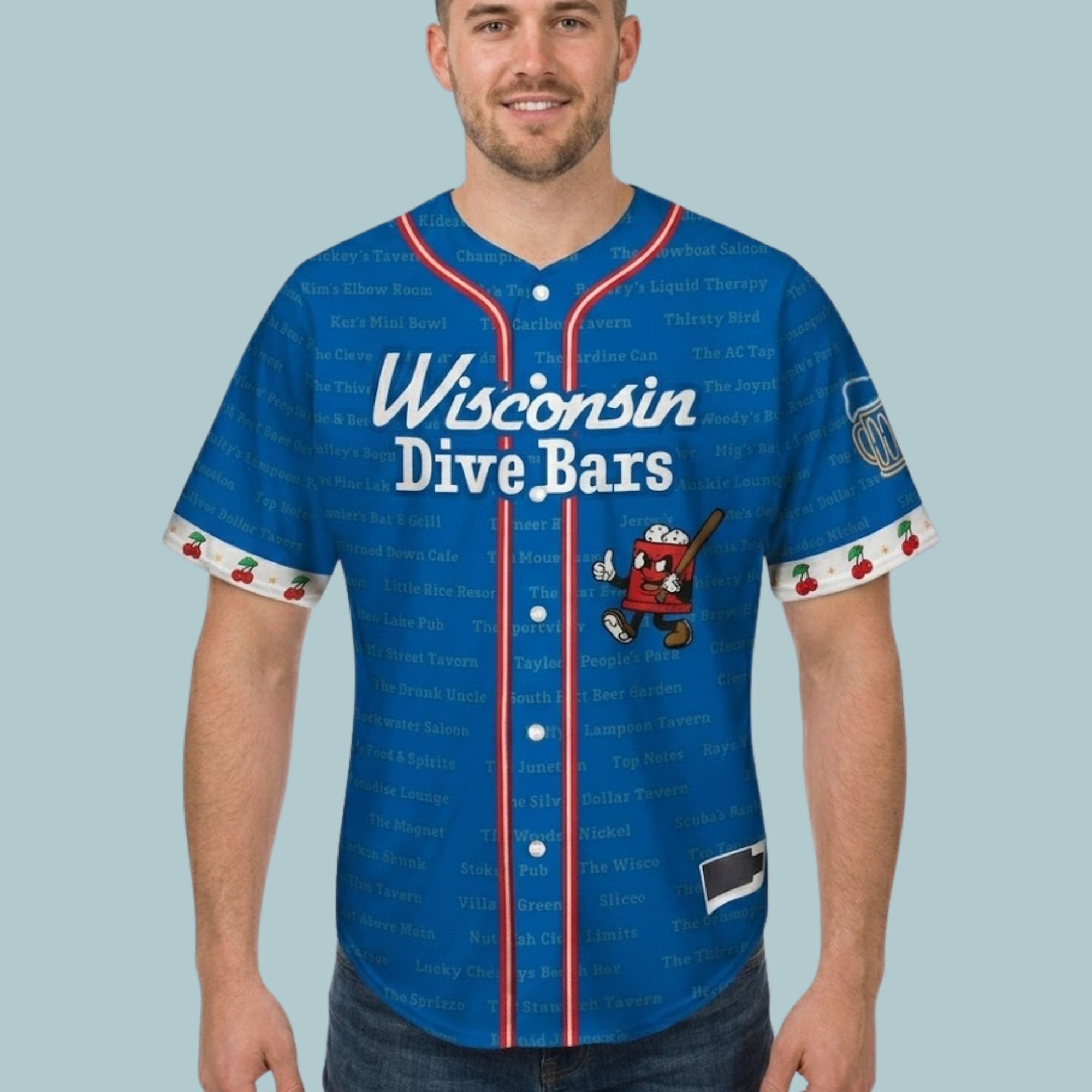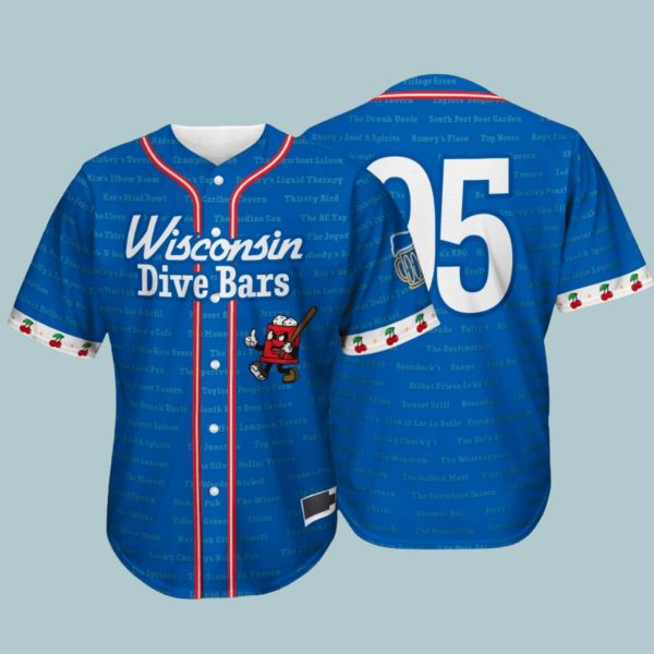 Featuring an intricate all-over print listing iconic dive bars from across the state, this jersey is a conversation starter whether you’re at the ballpark, a Friday night fish fry, or your favorite local spot.