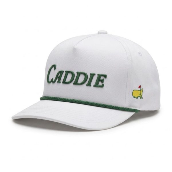 The structured 5-panel design proudly displays the word “CADDIE” in thick, raised forest-green embroidery, perfectly matching the retro braided rope that rests across the brim. The signature tournament emblem is subtly stitched on the side.