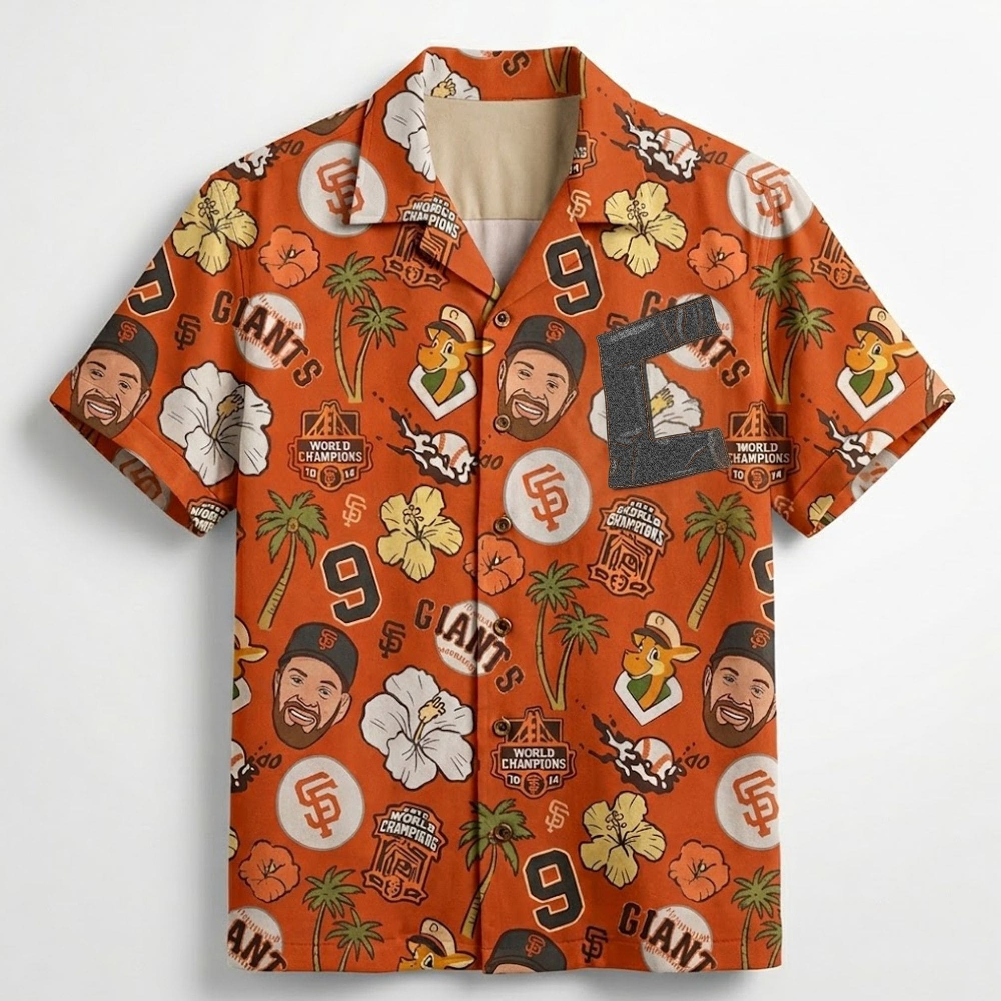 This vibrant orange Hawaiian shirt is fully loaded with custom artwork honoring #9. The all-over print features iconic tributes to Brandon Belt’s legendary career by the bay, including: