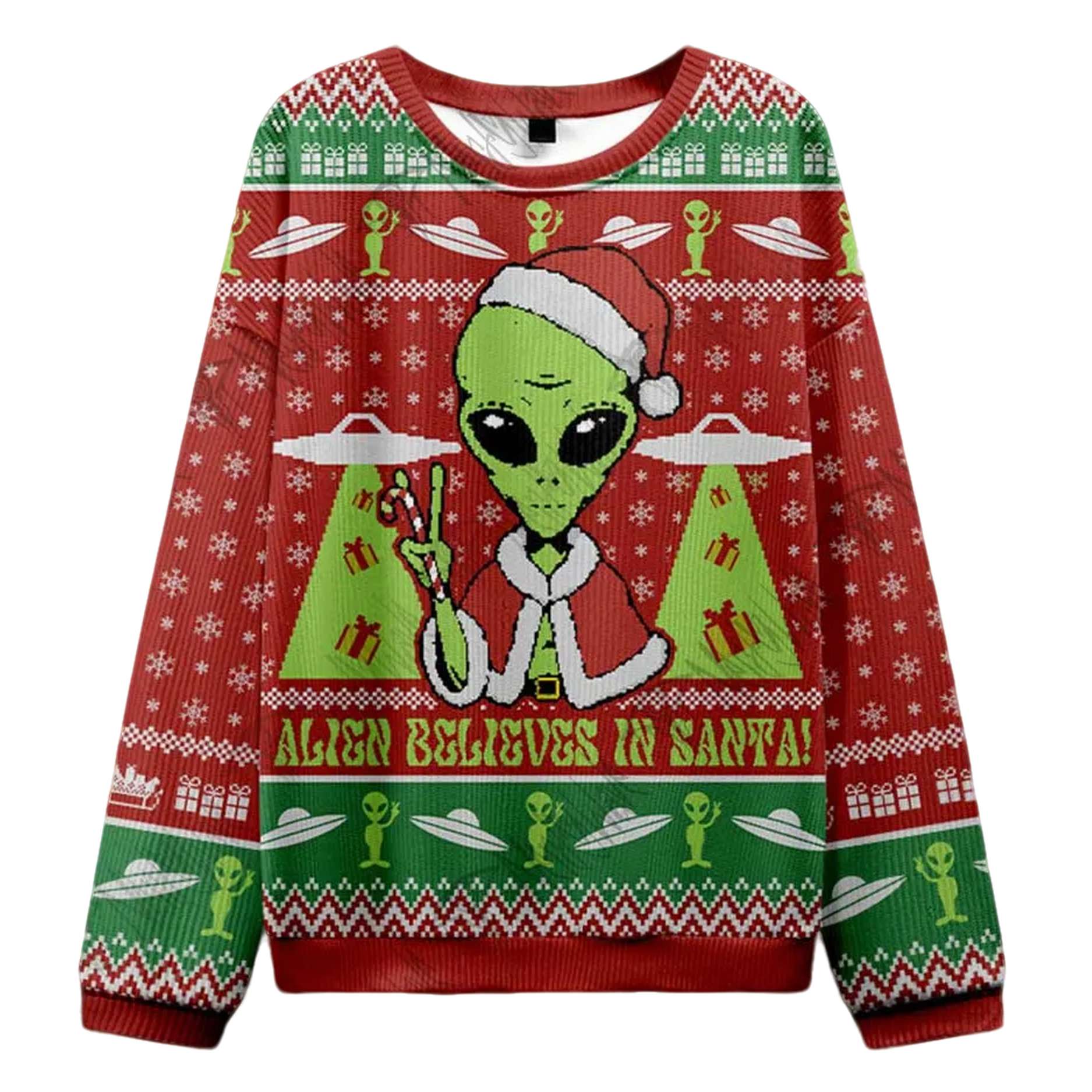Prepare for an intergalactic holiday season with the hilarious and festive “Alien Believes in Santa” Ugly Christmas Sweater!