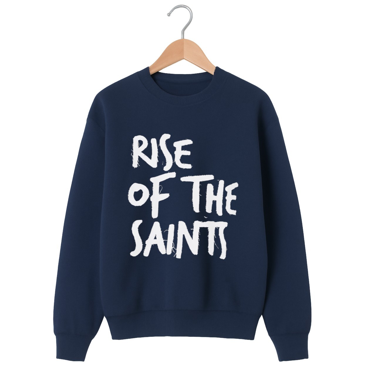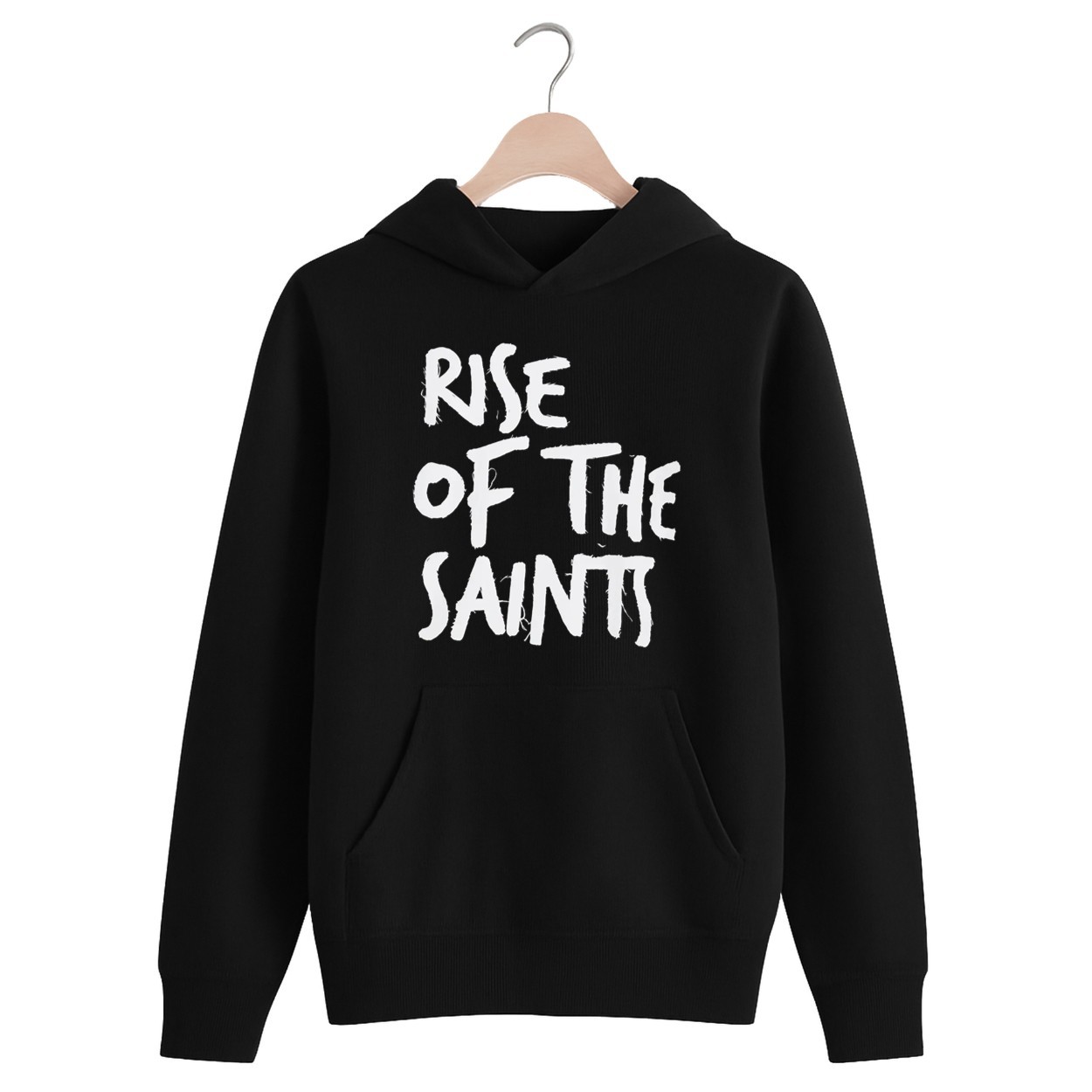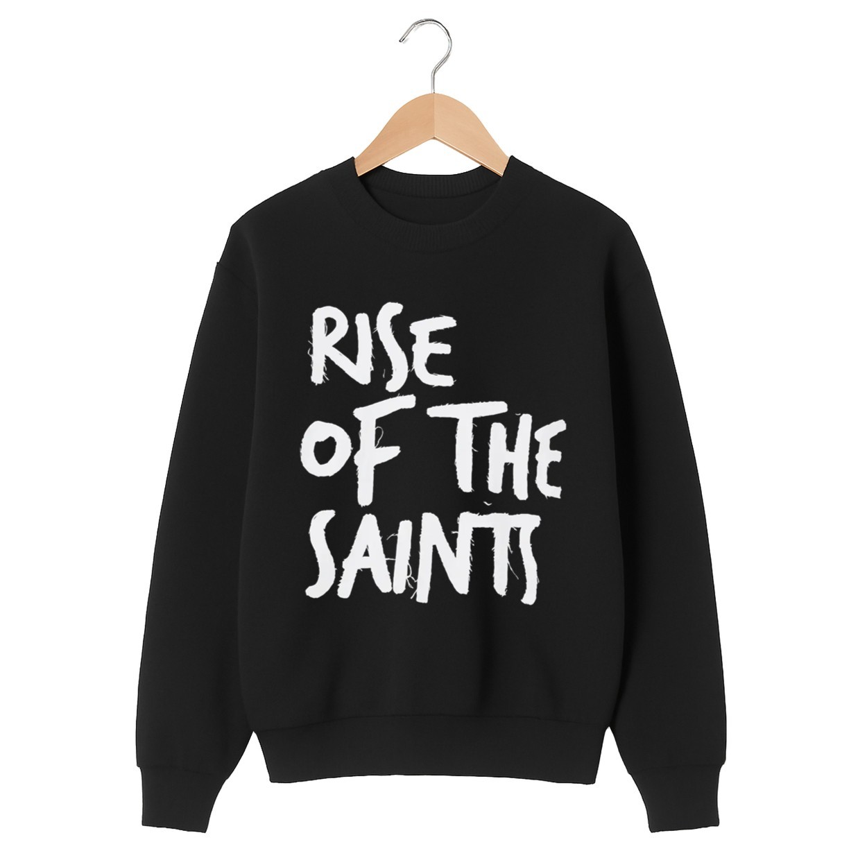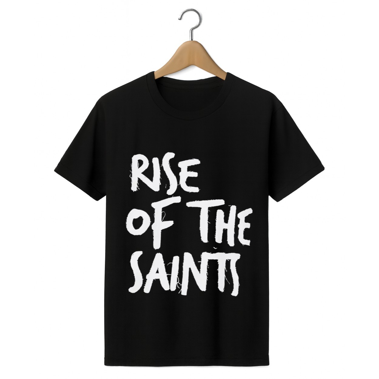The front showcases the powerful “RISE OF THE SAINTS” slogan in a rugged, brush-stroke font, creating a modern and edgy look.