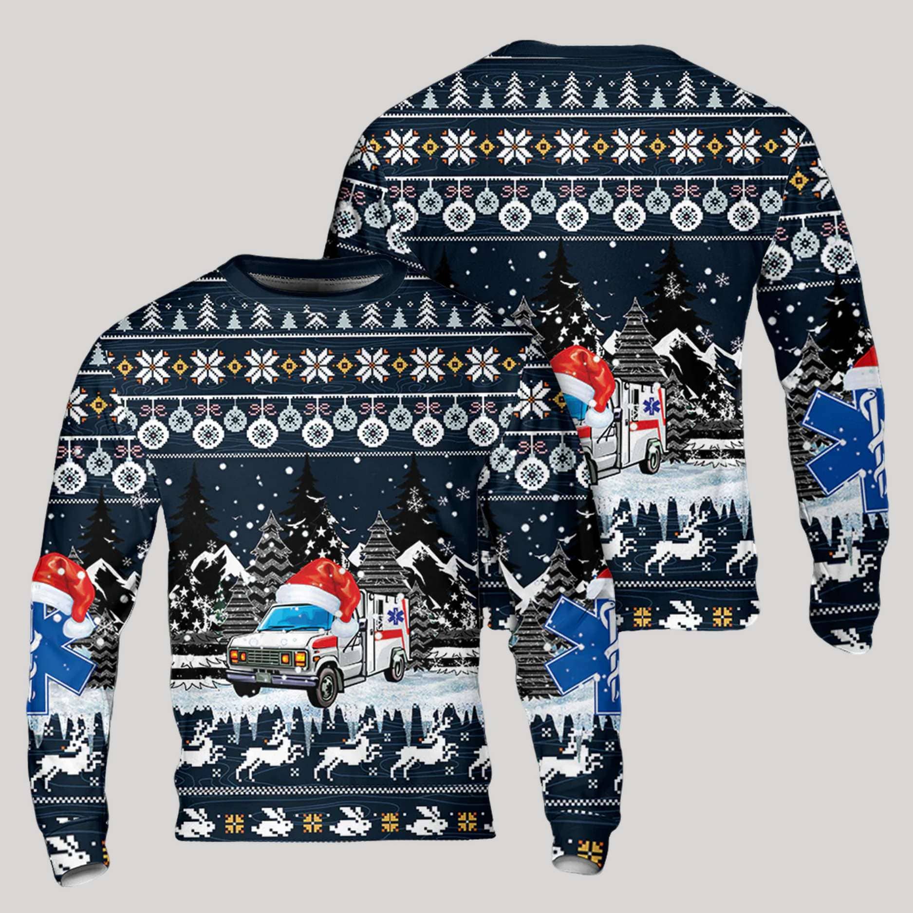 The sweater features a classic and cozy Navy Blue and White color scheme, mimicking a cold, snowy night. It’s richly patterned with traditional Nordic-style holiday motifs like snowflakes, reindeer, and pine trees, which are cleverly integrated with the Star of Life symbol and tiny Christmas accents. The centerpiece is a detailed, full-color graphic of an Ambulance, wearing a festive Santa hat and shown driving through a snowy forest.