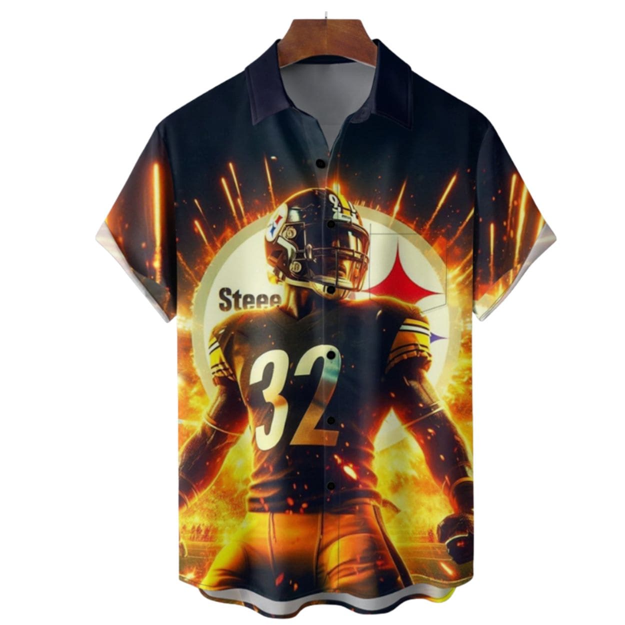 Design Details: The shirt showcases a dynamic, high-definition art print centered around a Steelers player in full uniform, wearing number 32, emerging from a background of intense orange and yellow flames and sparks. The iconic Steelmark logo is prominently featured behind the player’s helmet.
