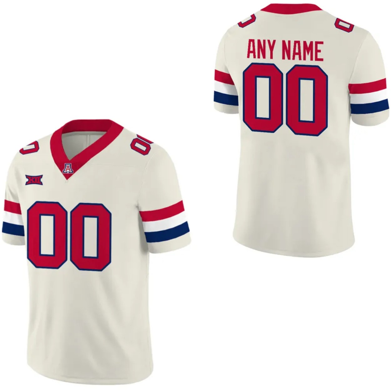 This jersey features the striking ‘Sandstorm’ cream colorway, a popular alternate that evokes the arid beauty of the Arizona landscape. It boasts a classic football jersey silhouette with a v-neck collar trimmed in vibrant red. The sleeves are accented with bold red, white, and blue stripes, reflecting the Wildcats’ iconic colors. The front proudly displays “00” in bold red numbers outlined in navy, complete with a subtle “A” logo at the collar. The back offers full customization, allowing you to add “ANY NAME” above the matching “00” numbers, making this jersey uniquely yours or a perfect gift for a fellow Wildcat.