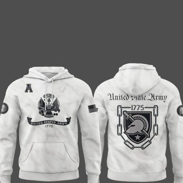 Back: Features a bold graphic that includes the text “United State Army – 1775” in a stylized font, overlaying a shield, helmet, and chain link motif, representing commitment and protection.