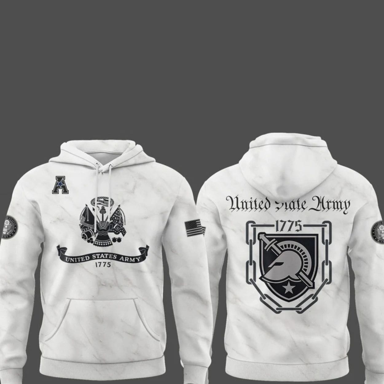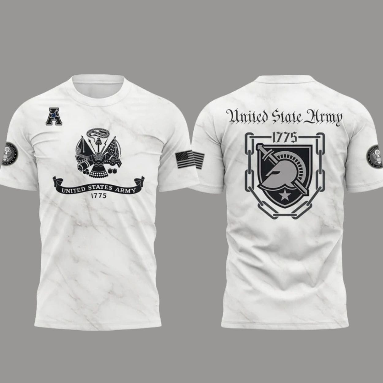 Front: Displays the USA emblem (1775) in black, topped with an ‘A’ for Army. A small American Flag graphic is featured on the sleeve.