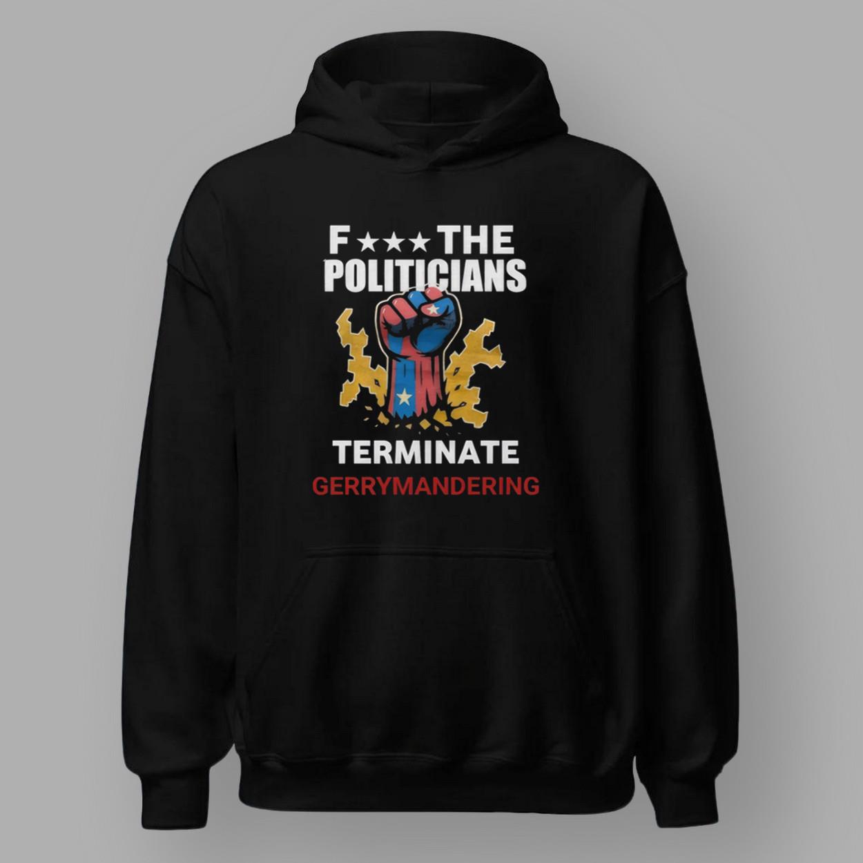 - A bold, white-on-black text reads “F*** THE POLITICIANS” and “TERMINATE GERRYMANDERING,” echoing Schwarzenegger’s no-nonsense approach to politics.