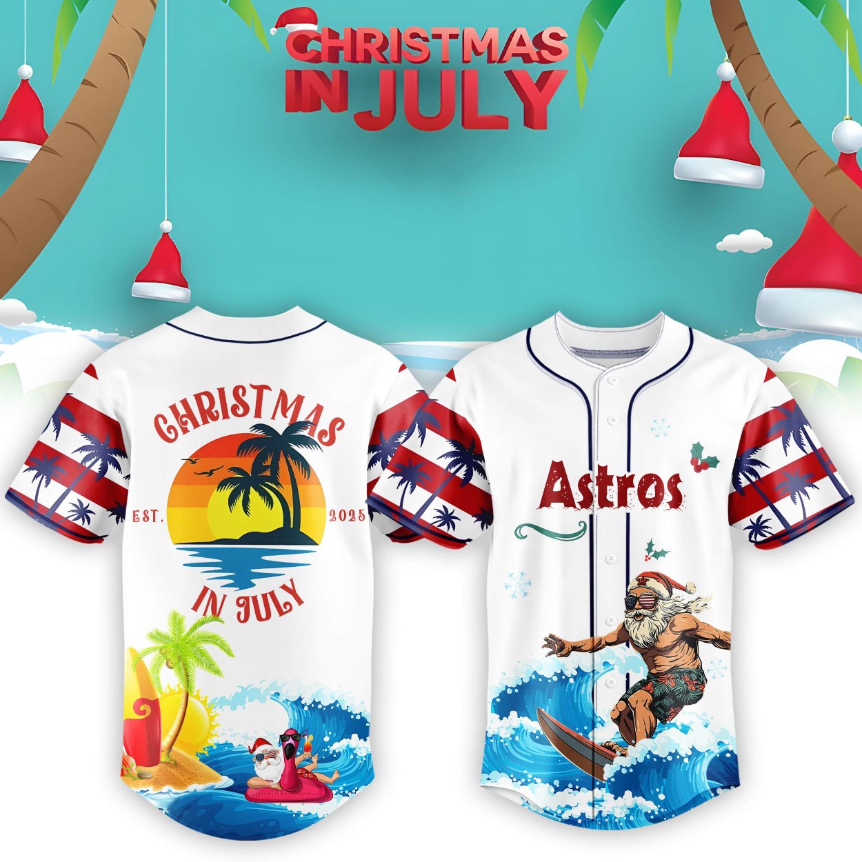 Embrace the festive summer vibe with the Astros Christmas July Santa 2025 Jersey! Available in sizes S-6XL, this polyester jersey merges holiday spirit with tropical flair. Featuring a surfing Santa in sunglasses and a red hat on the front, alongside the bold Astros logo, it’s a playful nod to Christmas in July. The back displays a stunning sunset with palm trees and “Christmas in July EST 2025,” accented by red, white, and blue stripes.