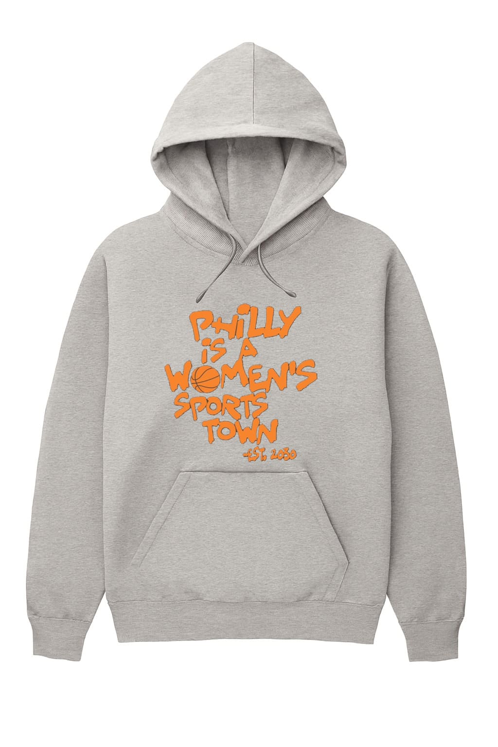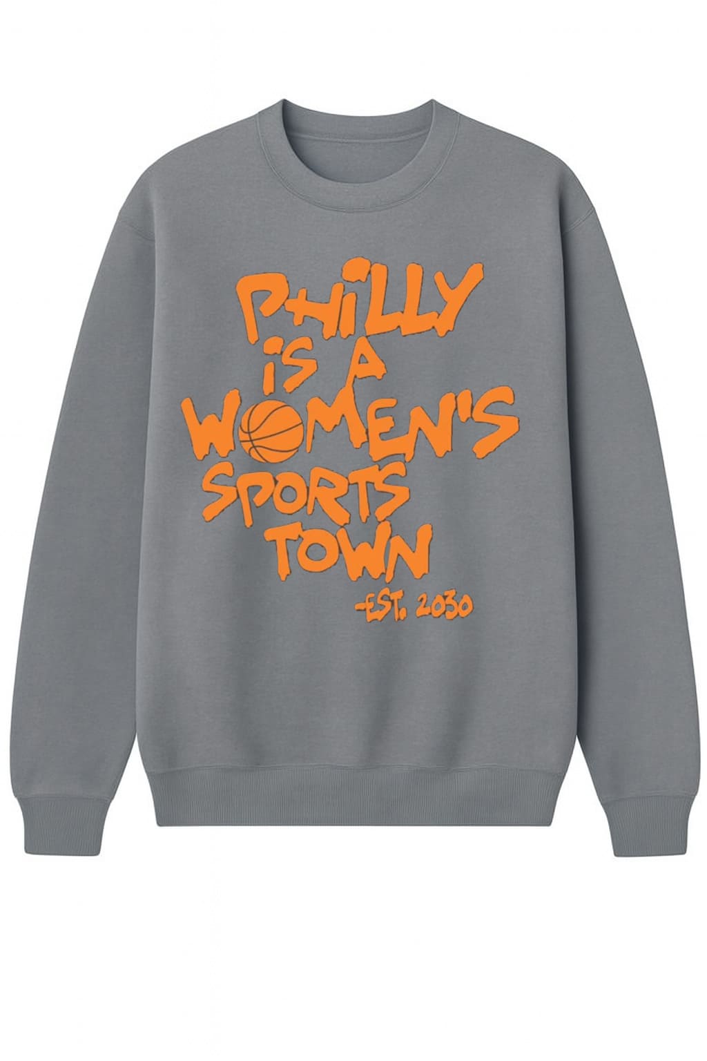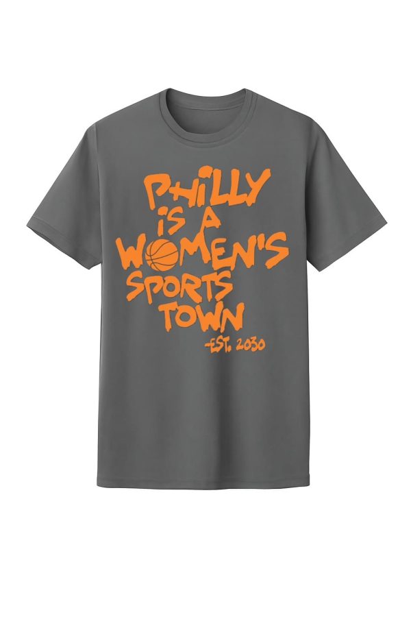 - Unique Design: The shirt stands out with its bold, orange graffiti-style text “PHILLY IS A WOMEN’S SPORTS TOWN.” A basketball is cleverly integrated in place of the ‘O’ in “WOMEN’S,” creating an impressive focal point. The “-EST. 2030” line is a proud declaration of the future.