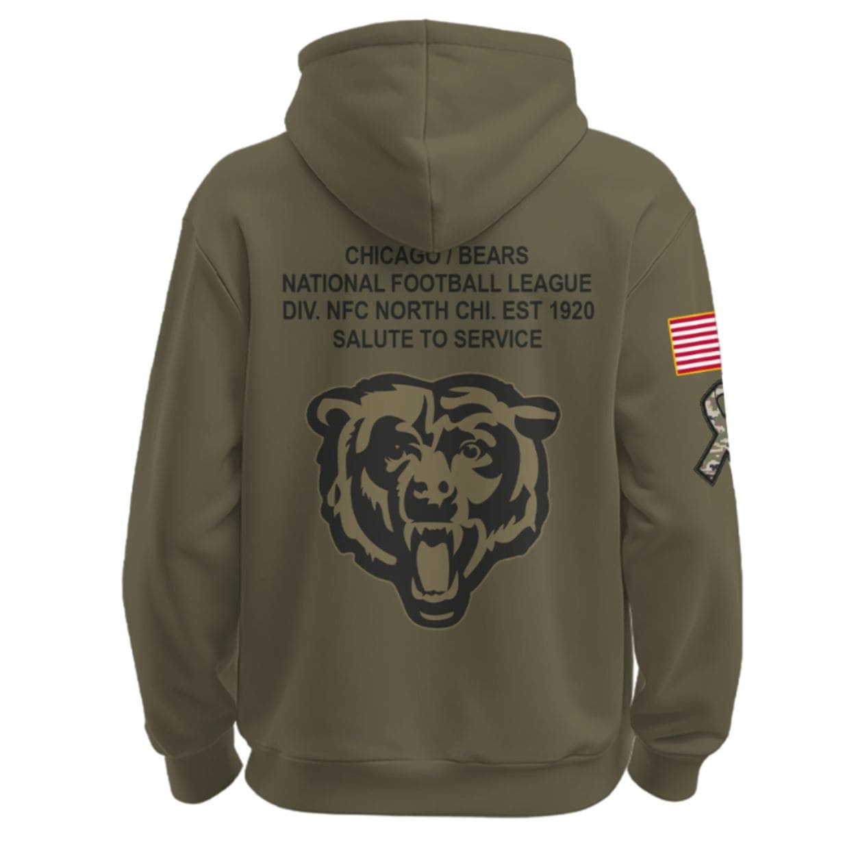 - Back: The reverse side boldly displays text detailing the team’s military connection and founding: “CHICAGO / BEARS NATIONAL FOOTBALL LEAGUE DIV. NFC NORTH CHI. EST 1920 SALUTE TO SERVICE”. Below this text, a large, silhouetted Bears Head logo is featured in a subtle, camo-style tone, cementing team identity.