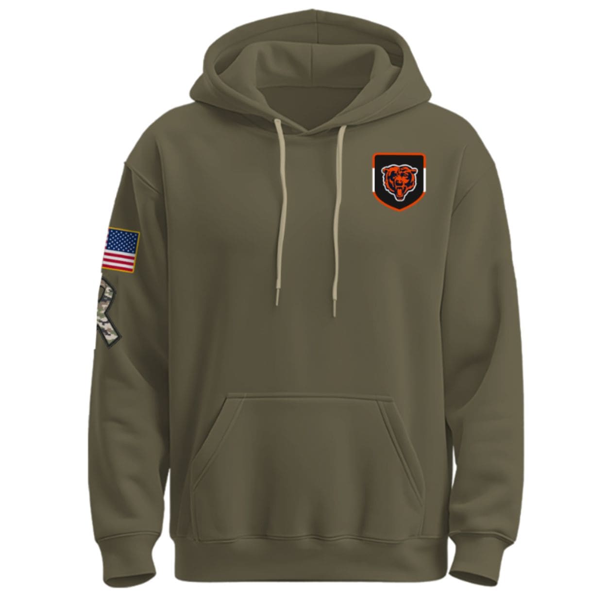 - Front : The chest proudly features a design with the Bears Head logo inside, signifying strength and commitment. The left sleeve features an American Flag patch and military camouflage accents, clearly honoring the armed forces.