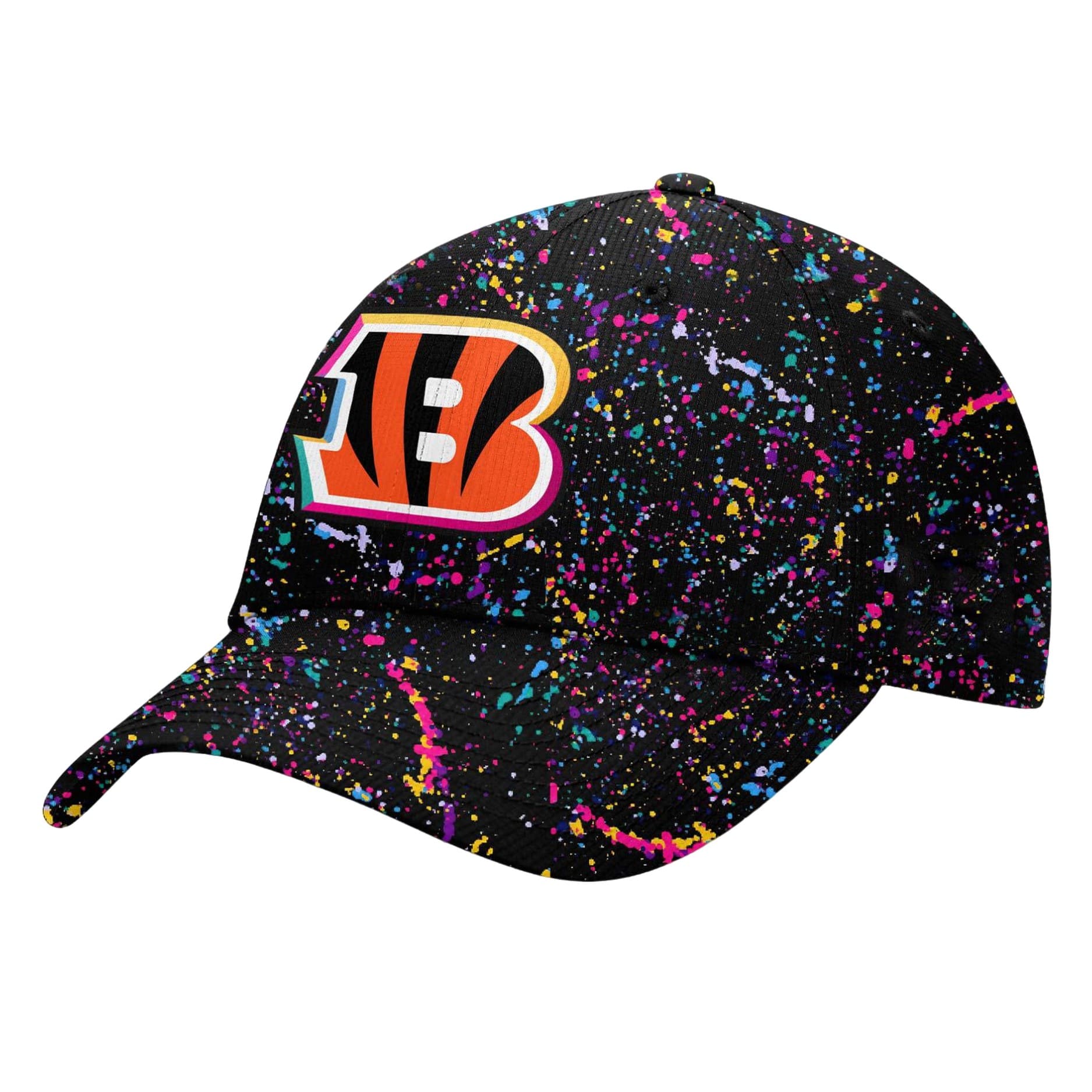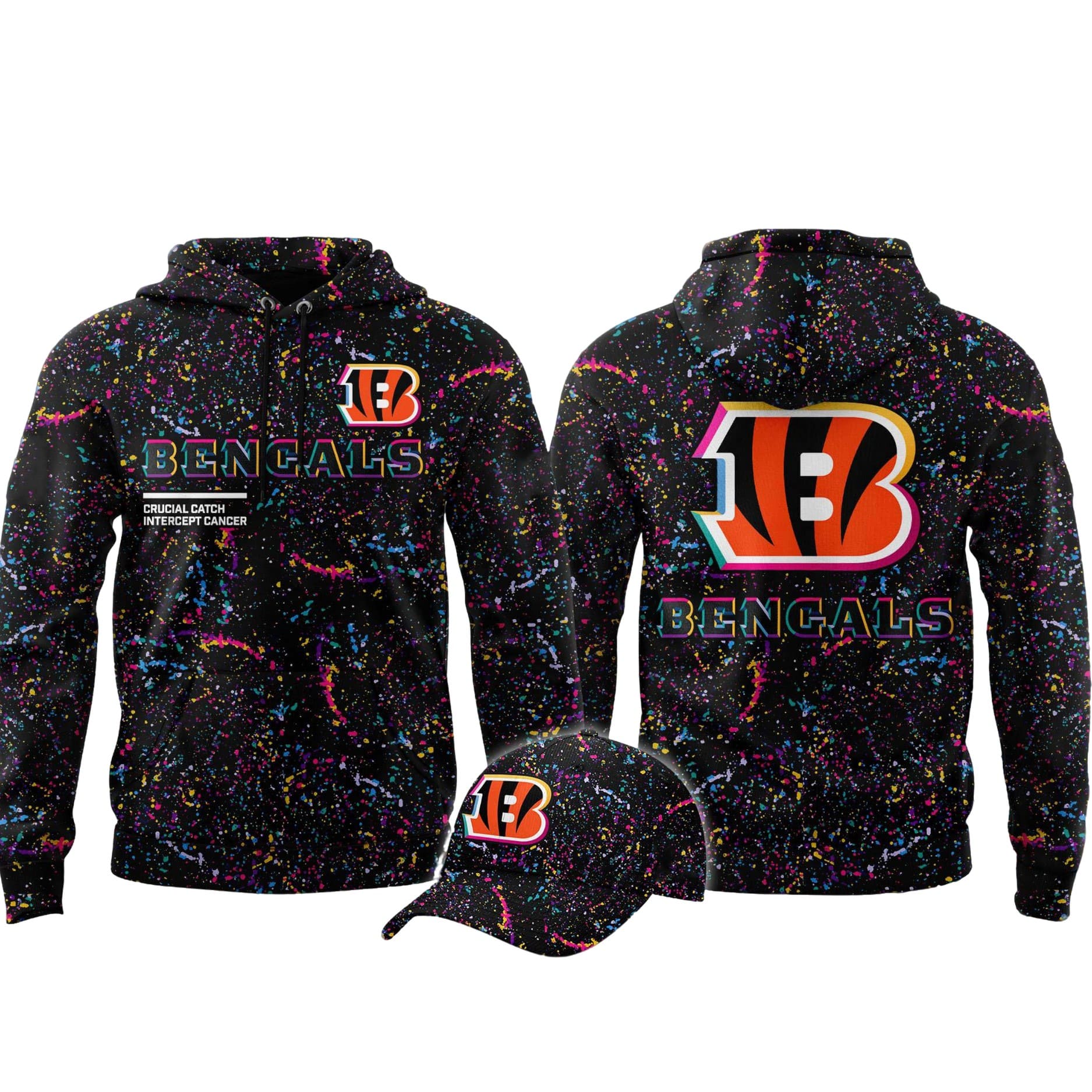 The Front showcases the Cincinnati Bengals “B” logo and “BENGALS” wordmark with a unique rainbow/neon outline, symbolizing the various cancers the initiative supports. Below the logo, the slogan “CRUCIAL CATCH INTERCEPT CANCER” is printed near the hood.