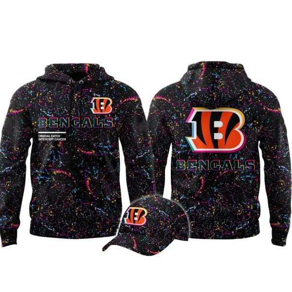 Join the fight against cancer and make a vibrant statement with the striking Bengals 2025 Crucial Catch Hoodie!