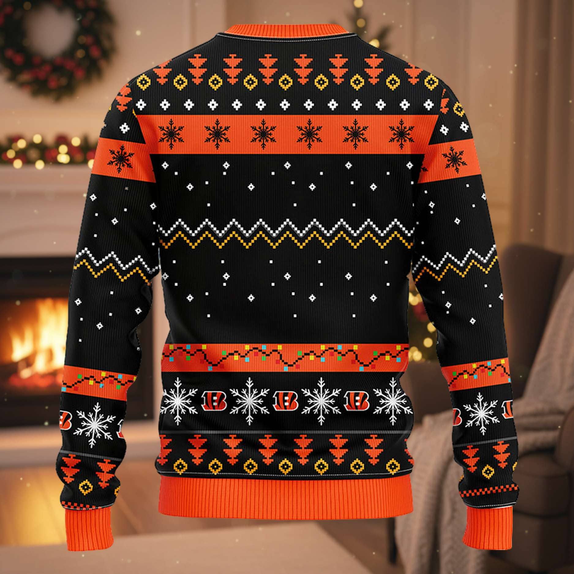The sweater features a festive Black and Orange background, richly covered in traditional yet team-centric ugly Christmas sweater patterns: snowflakes, geometric shapes, and repeating Bengals logos. The centerpiece is a fantastic, full-color graphic of Santa Claus himself, sporting a Bengals helmet and a pair of sunglasses while striking the iconic dab pose. Next to him is a sack overflowing with presents adorned with the team’s signature black and orange colors. The back of the sweater continues the festive-fandom blend with intricate patterns and repeating “B” logos and stars.